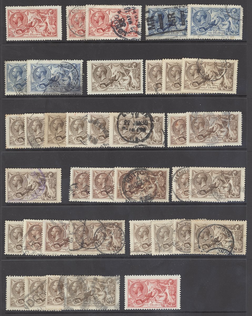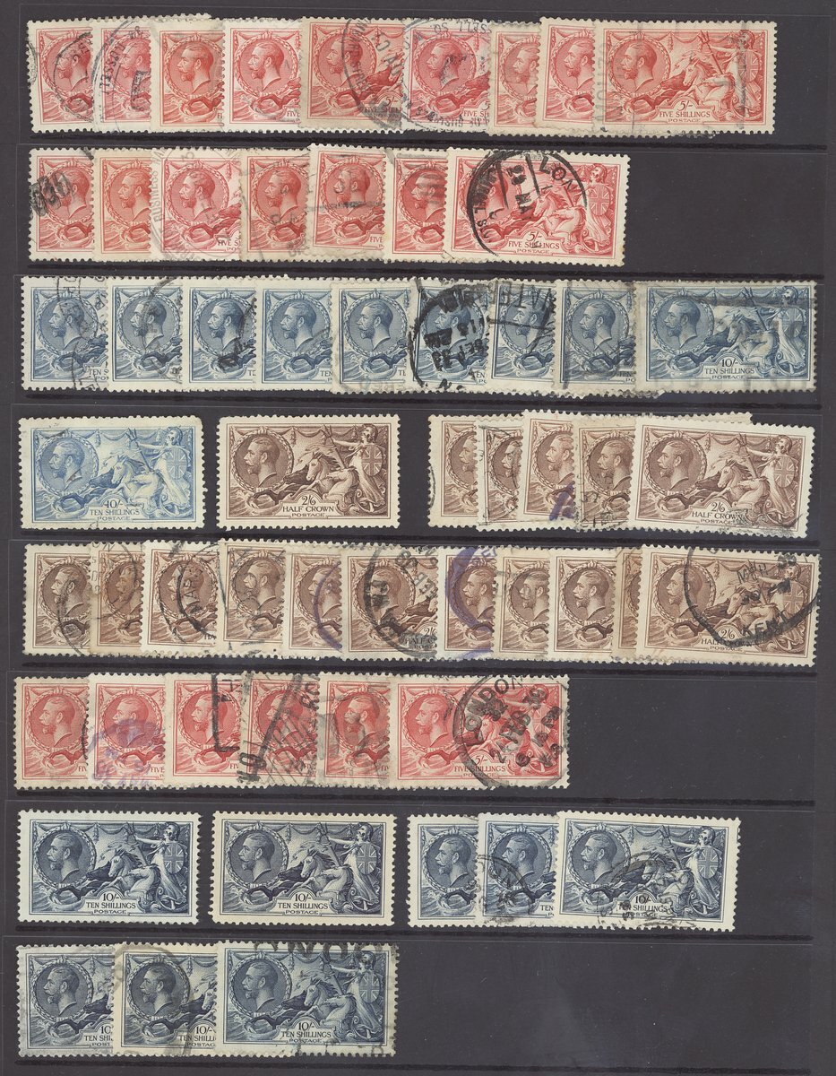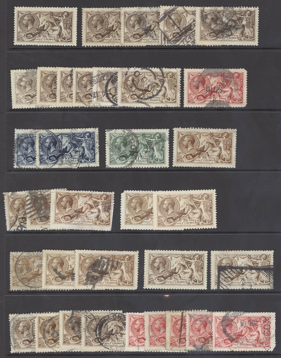A mostly used collection c.130 on stock pages with 1913 Waterlow 2/6d. deep sepia-brown mint and used shades (10), 5/- used, 10/- used (2), £1 used, 1915 2/6d. used shades, 5/- one mint, 10/- used (4), 1918 5/- rose-red mint and many used remaining values, 1924-26 values, 1935 10/- mint (2). Some faults throughout though a good lot