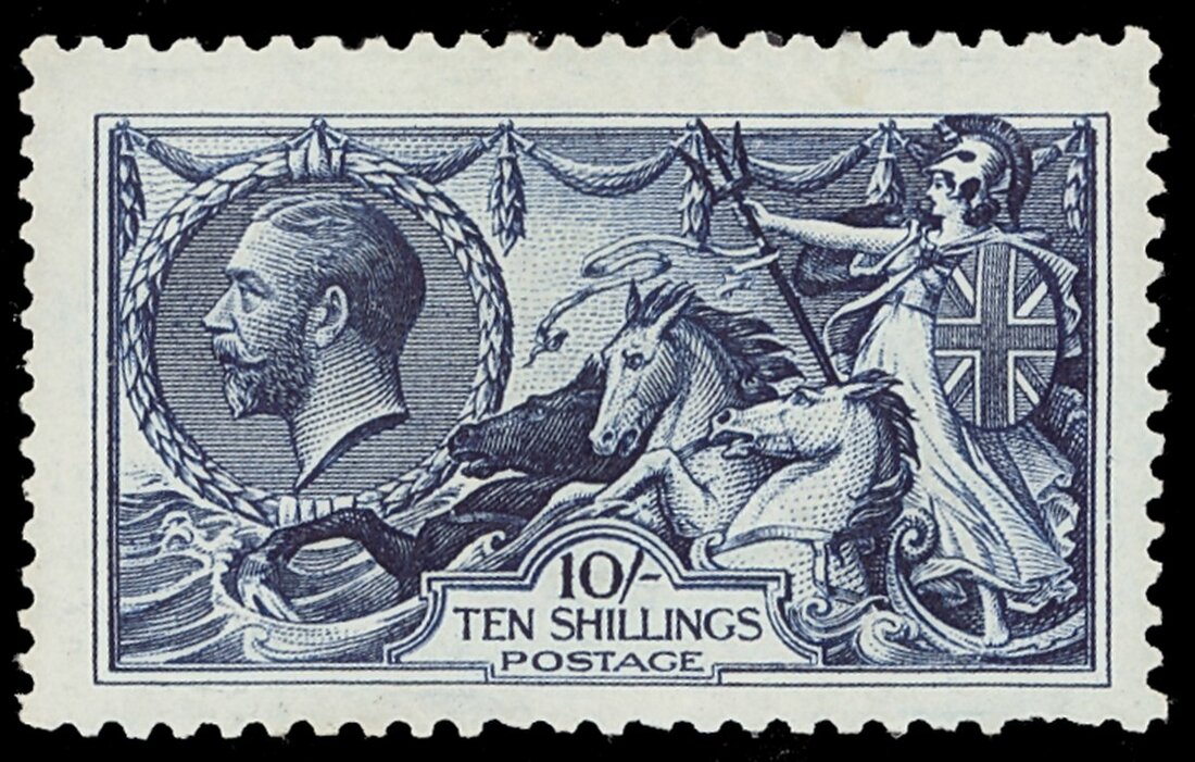 10/- indigo-blue, large part original gum, rich colour; short perf. at foot. S.G. 402, £1,000