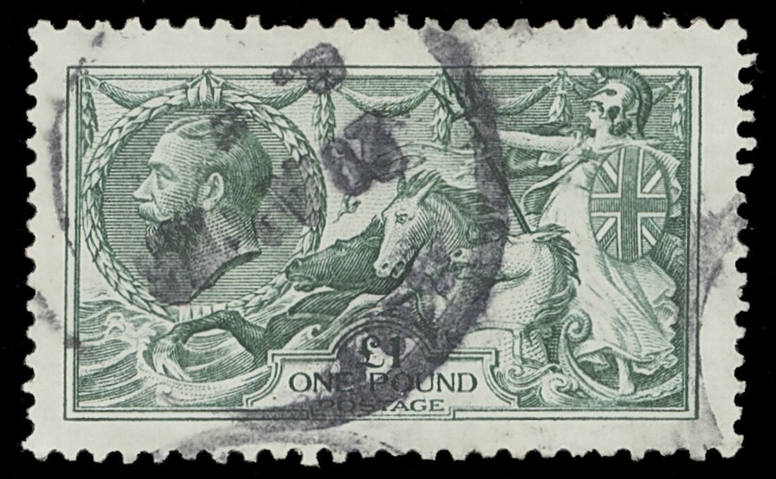 £1 dull blue-green, cancelled by an indistinct parcel c.d.s.; good centring; ,creased corner perf. and a couple of slightly short perfs. S.G. 404, £1600