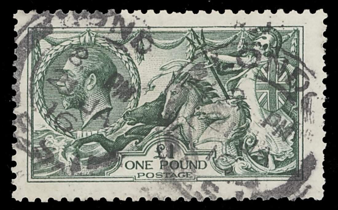 £1 dull blue-green, cancelled by two strikes of London c.d.s., good centring; some short perfs. S.G. 404, £1,600