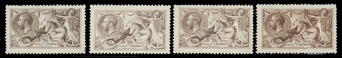 2/6d. group of unused shades with seal brown, pale brown, grey-brown (2) and deep yellow-brown, part to large part original gum; a few short or slightly short perfs. (4)