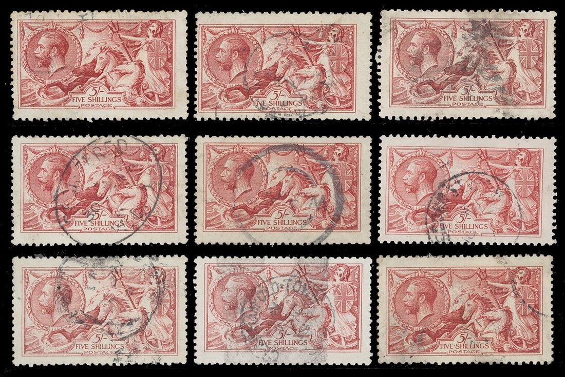 5/- range of shades from pale to bright and deep, most neatly cancelled; a few minor imperfections. (9)