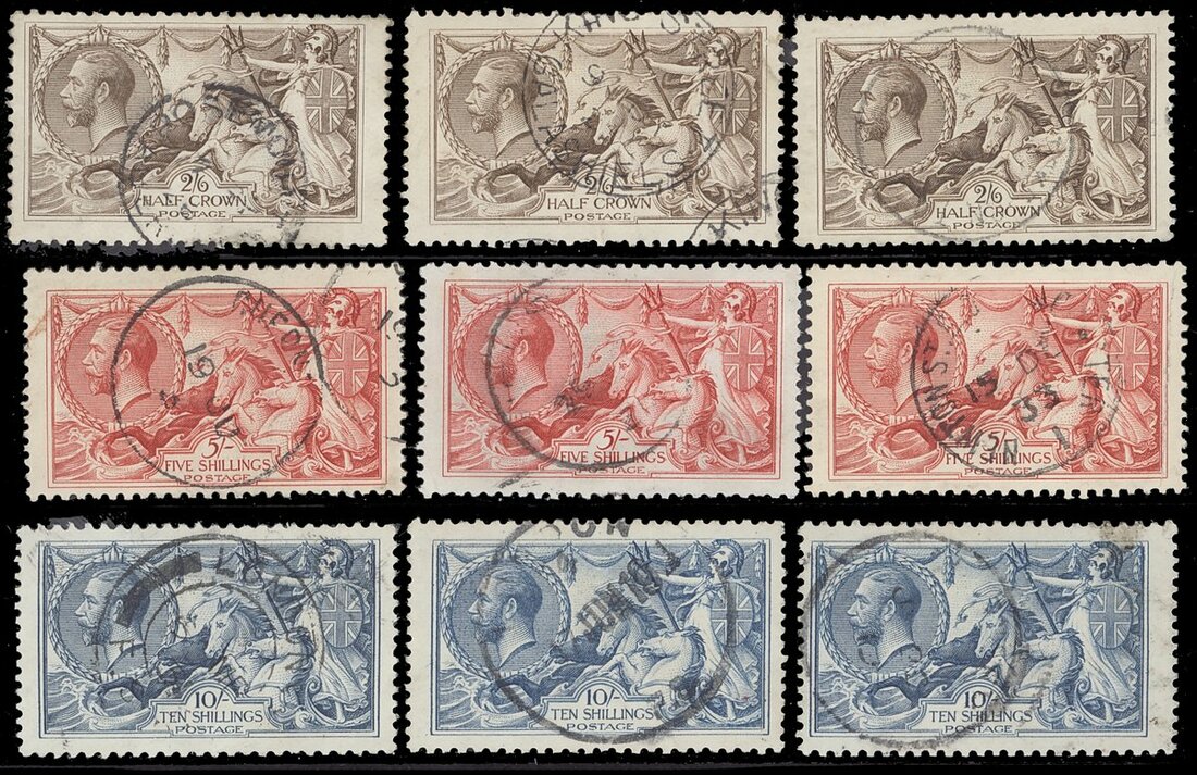 2/6d. to 10/- good to fine used with c.d.s.; one 10/- with light crease and a few minor age marks, generally good to fine. (9)