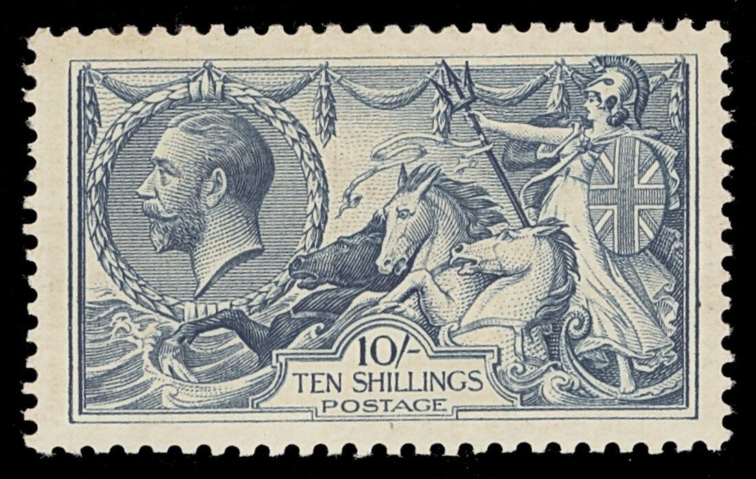10/- steel blue, large part original gum; gum toning and thin spot. R.P.S. Certificate (1989). S.G. N71 (3), £1,100