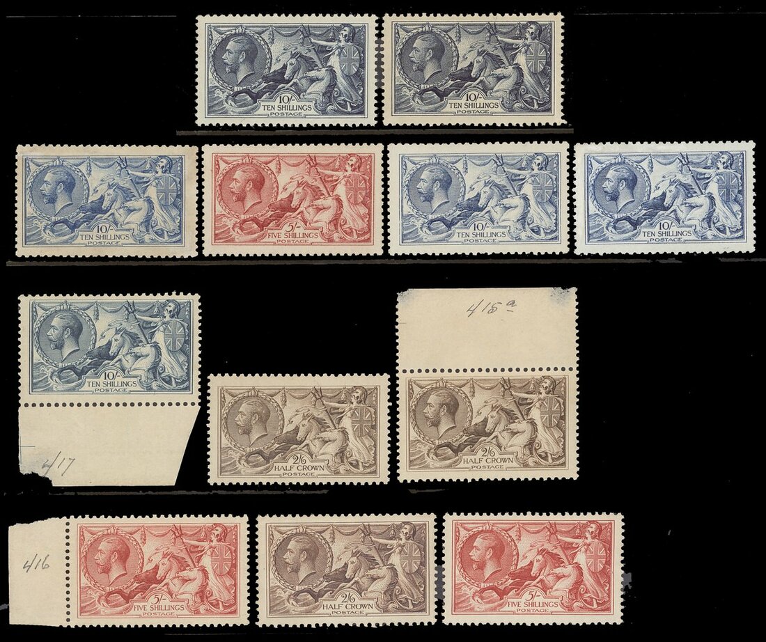 A selection of unused high values, Seahorses with De la Rue 5/- and 10/- (3 shades) one with small repair, Bradbury Wilkinson set of three and 1934 Re-Engraved set plus additional 10/-; all with toned gum of varying severity. (13)