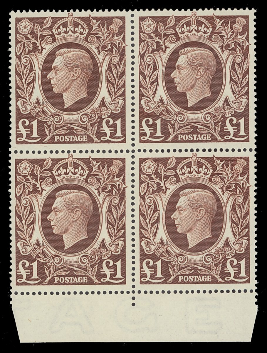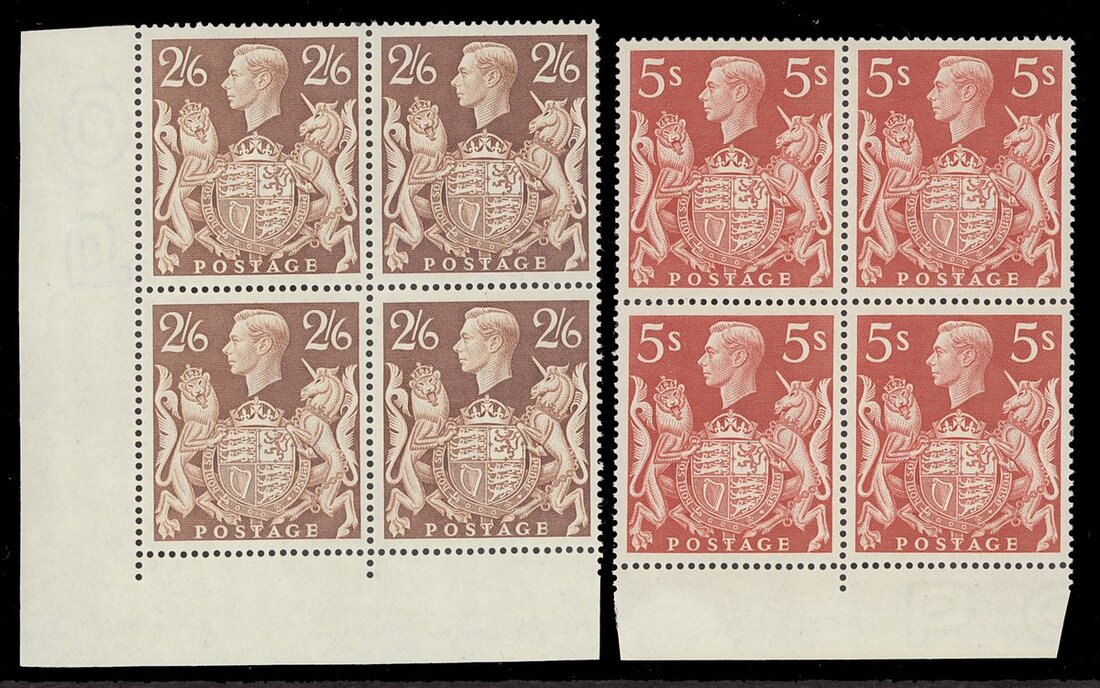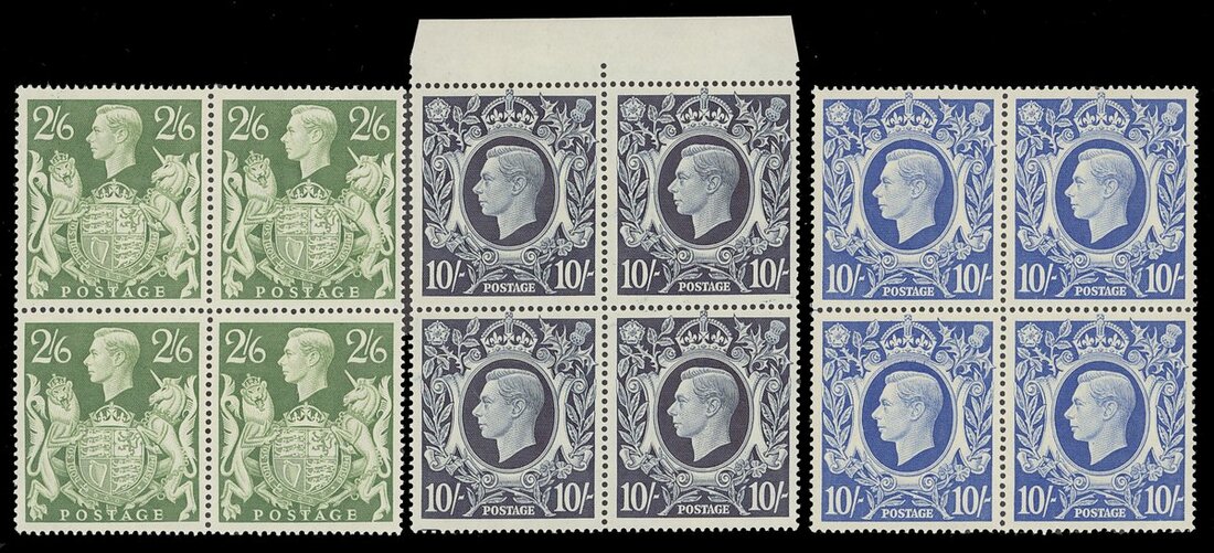 2/6d. to £1 set of six unmounted mint blocks of four, 2/6d., 5/-, 10/- dark blue and £1 marginal examples; fine. S.G. 476-478c, £1,700
