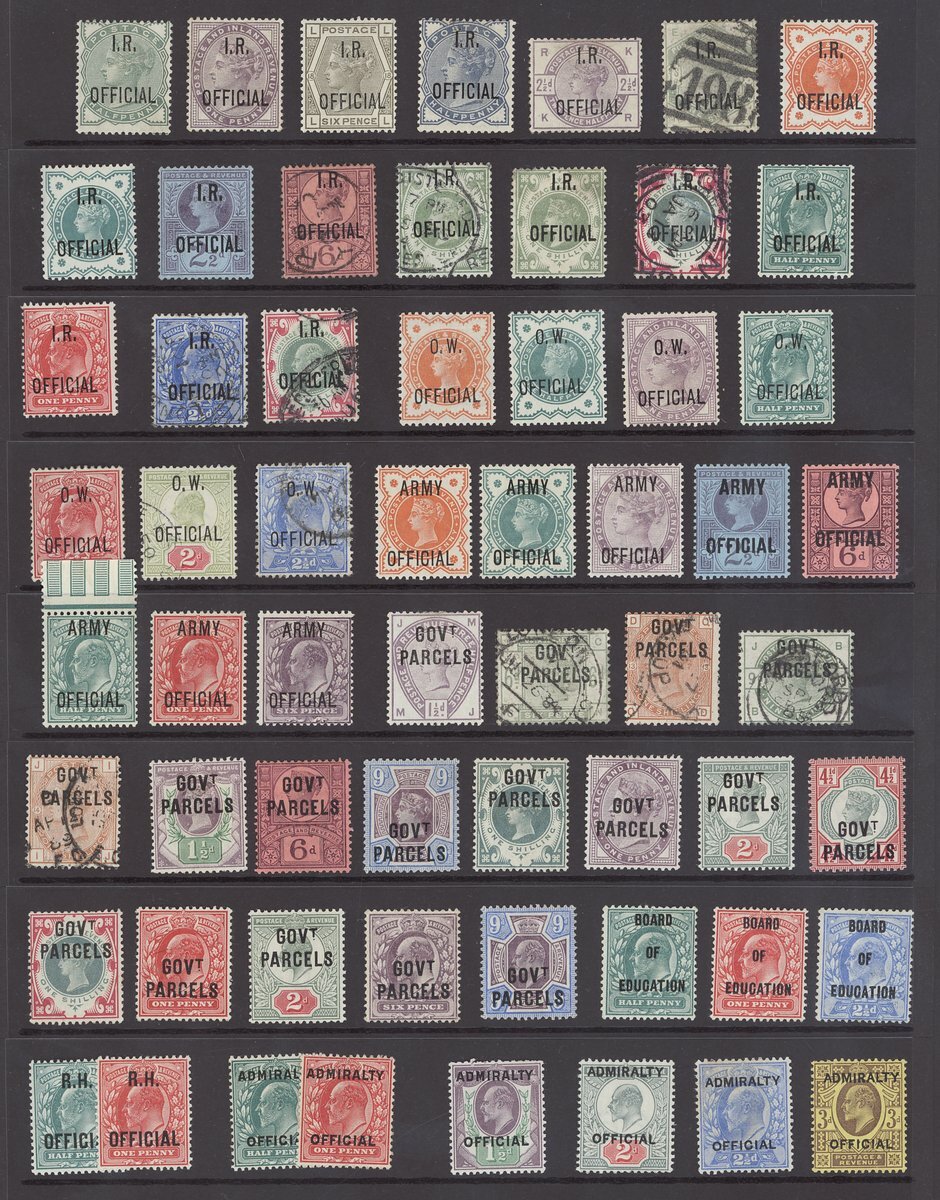 1882-1904 mint and used group including Inland Revenue 6d. grey, 2½d. lilac and 1887-92 1/- dull green (faults) unused Office of Works ½d. vermilion, ½d. blue-green and 1d. lilac; Government Parcels 1883-86 6d. dull green, 9d. dull green and 1/- orange-brown all used, 1887-90 1½d. dull purple and pale green, 6d. purple on rose-red, 9d. dull purple and blue and 1/- dull green, 1891-1900 1d. lilac, 2d. grey-green and carmine, 4½d. green and carmine and 1/- green and carmine; Royal Household 1902 ½d. blue-green and 1d. scarlet; Admiralty Official 1903 2d. green and carmine, 2½d. ultramarine and 3d. purple on orange-yellow; chiefly good to fine; some dubious overprints, not guaranteed and sold as seen