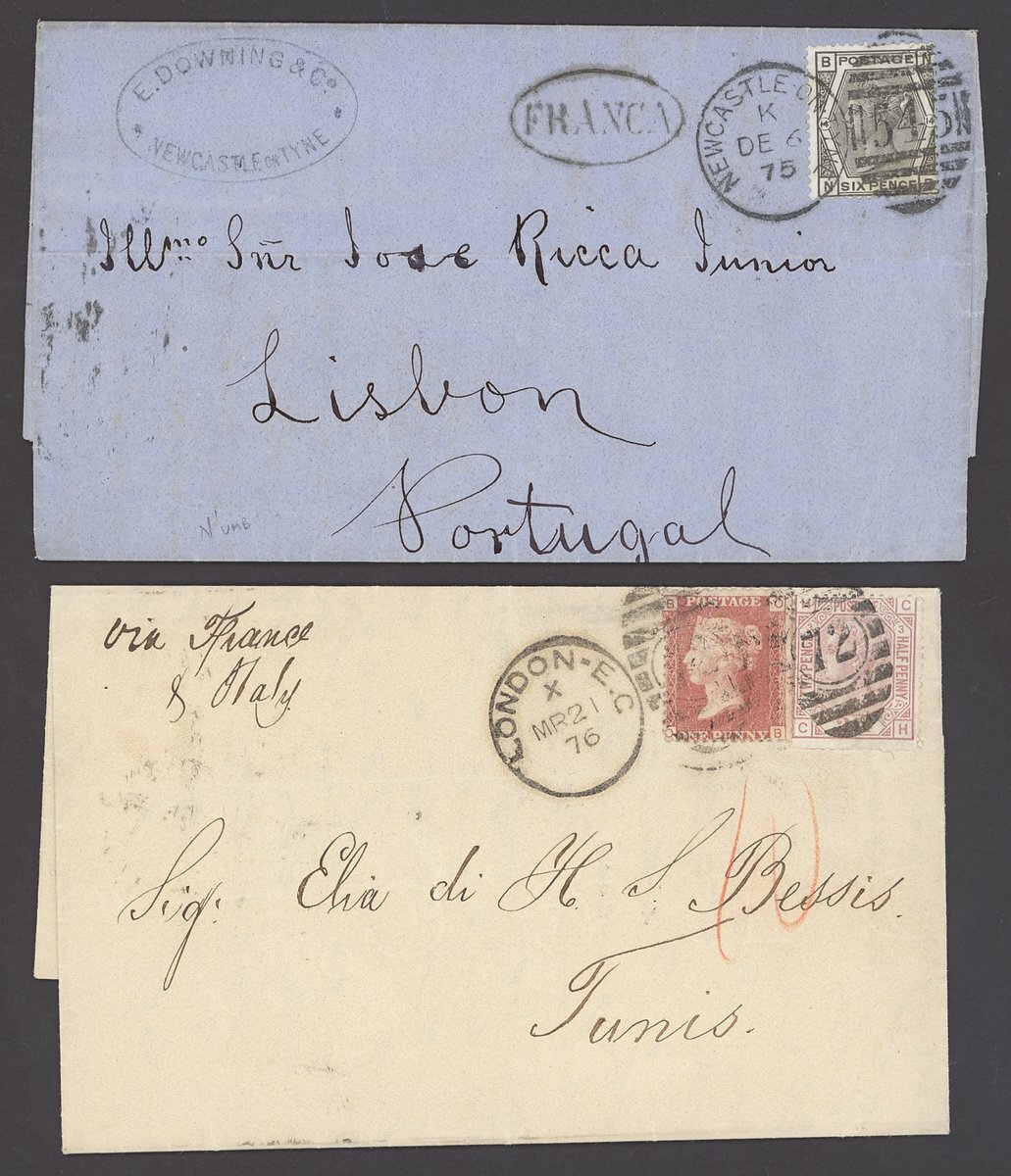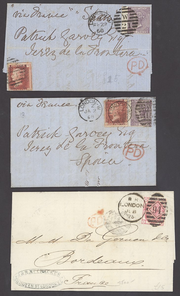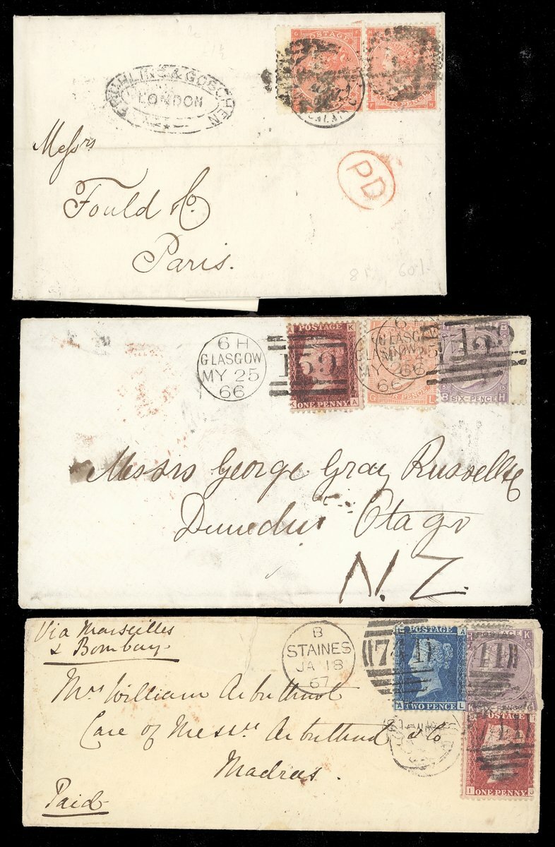 A group of Q.V. covers to overseas destinations including 1864 entire to Paris with 1862-64 4d. pair, 1866 envelope to New Zealand with 11d. franking, 1867 envelope to Madras with 9d. franking, 1868 entires to Spain (2) with 7d. frankings, 1875 3d. franking to France, 1875 6d. franking to Portugal and 1876 3½d. franking to Tunis. Generally fair to good. (8 covers)