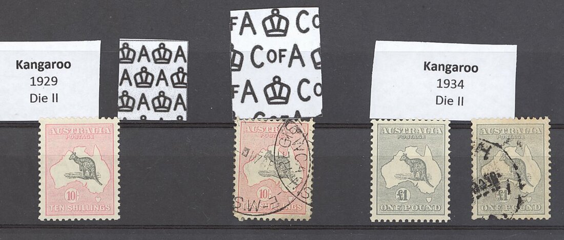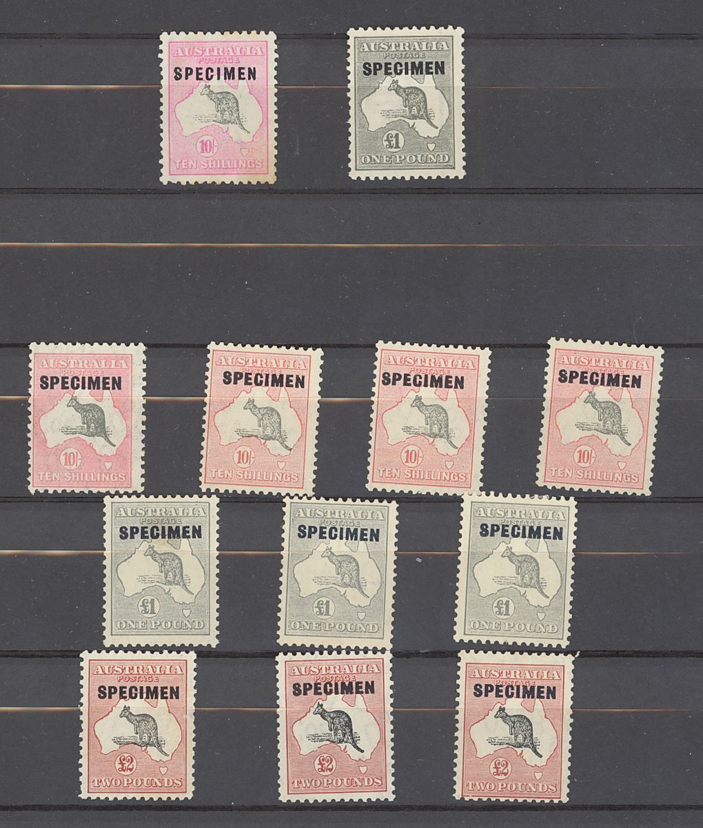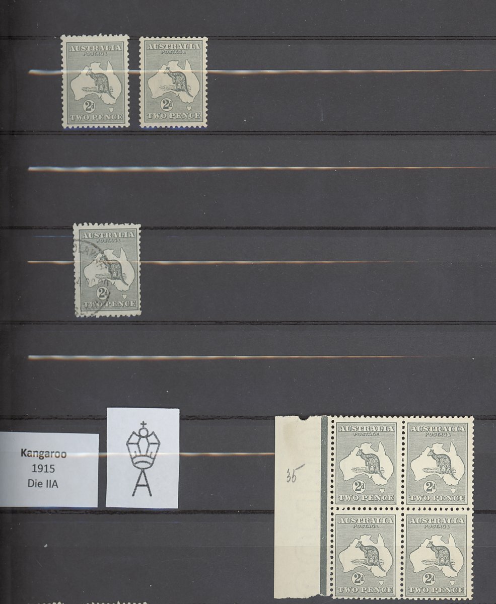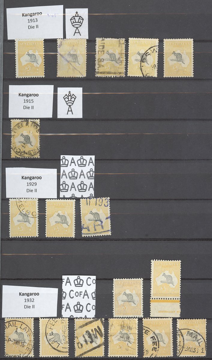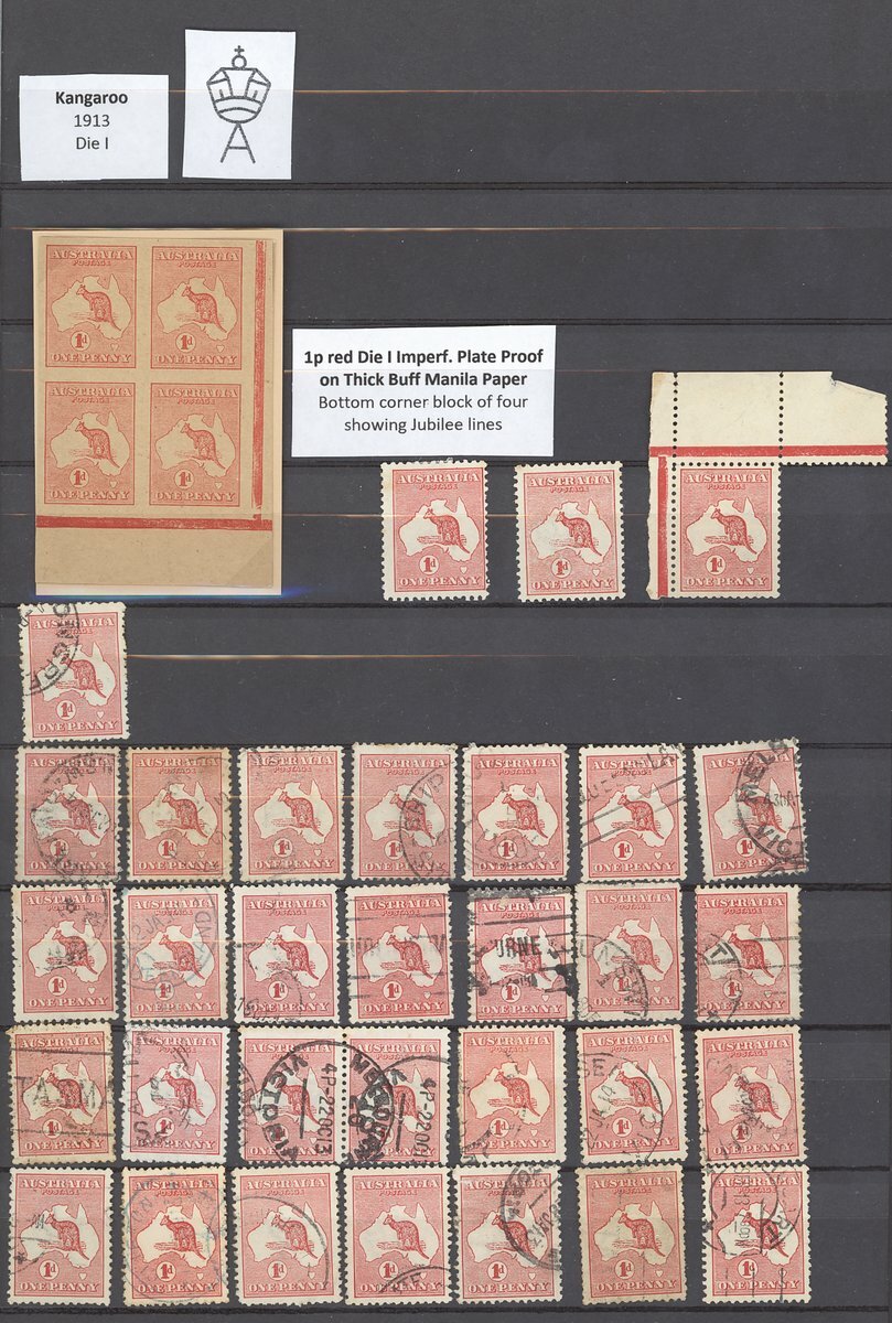 1913-45 Kangaroo collection in a stockbook, largely used though with some mint and including 1d. imperforate proofs on manila paper corner block of four and a marginal pair, 1913 few mint to 5/-, 1915-27 2d. and 2½d. mint blocks of four, 10/- overprinted "