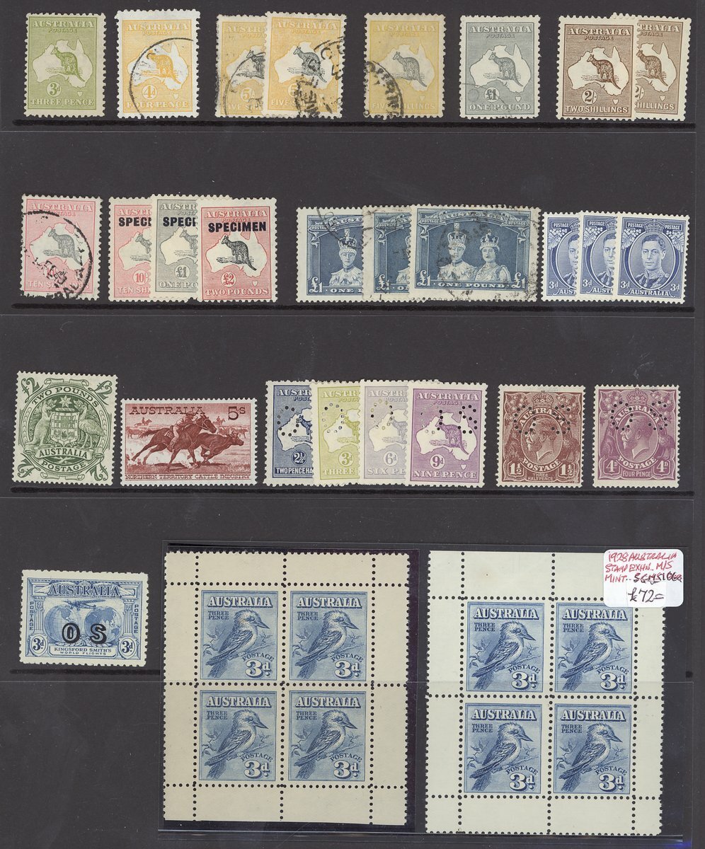 1915 2/- brown, 5/- used (2), 1915-27 5/- used, 1923-24 £1 grey used, 1928 Melbourne Exhibition 3d. miniature sheets (2), 1931-36 10/- used and 10/-, £1 and £2 '