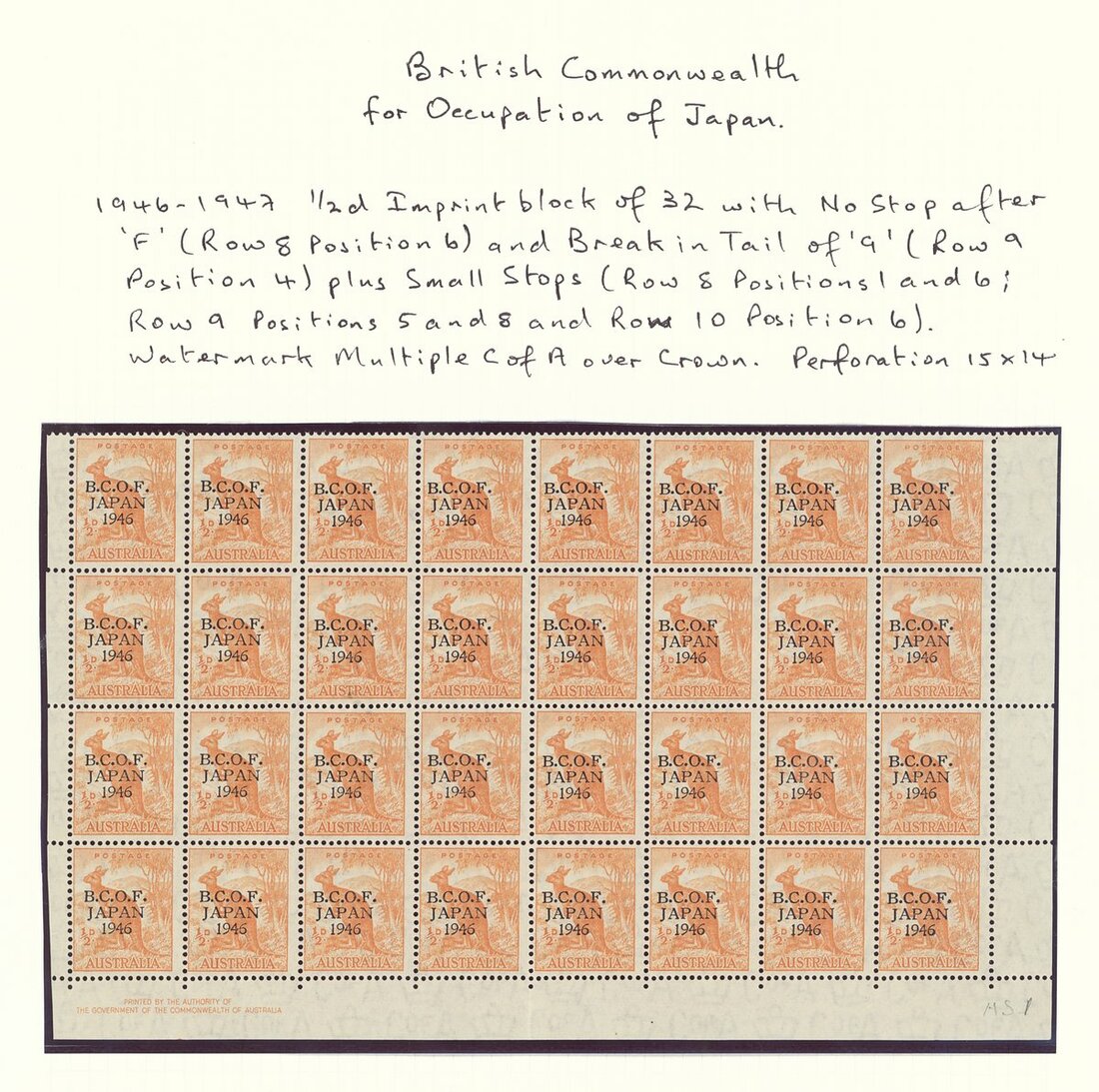 ½d. orange left corner imprint block of thirty-two with minor varieties such as no stop after
