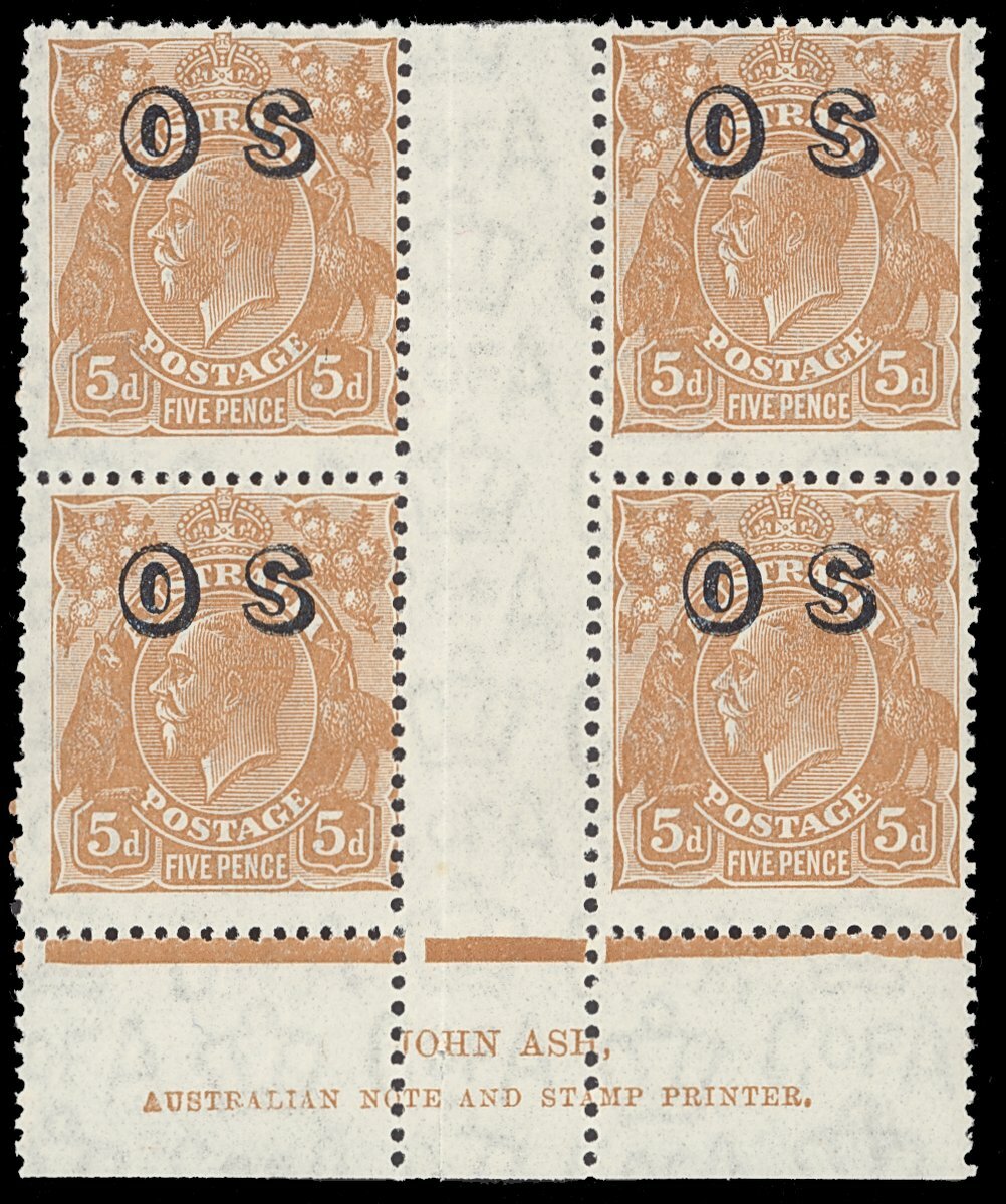 1932 (July) 5d. orange-brown Ash imprint block of four, fresh mint with the stamps unmounted; vertical crease and tiny hinge remainder in interpanneau margin. BW $575; S.G. O132