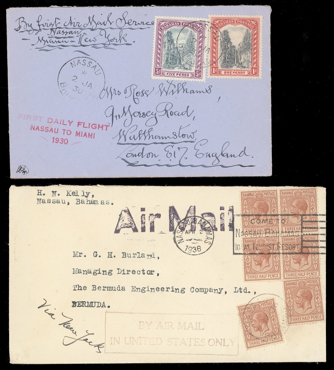 1930 (2 Jan.) 'First Daily Flight Nassau to Miami' envelope to London bearing 1911-19 1d. and 5d. tied by