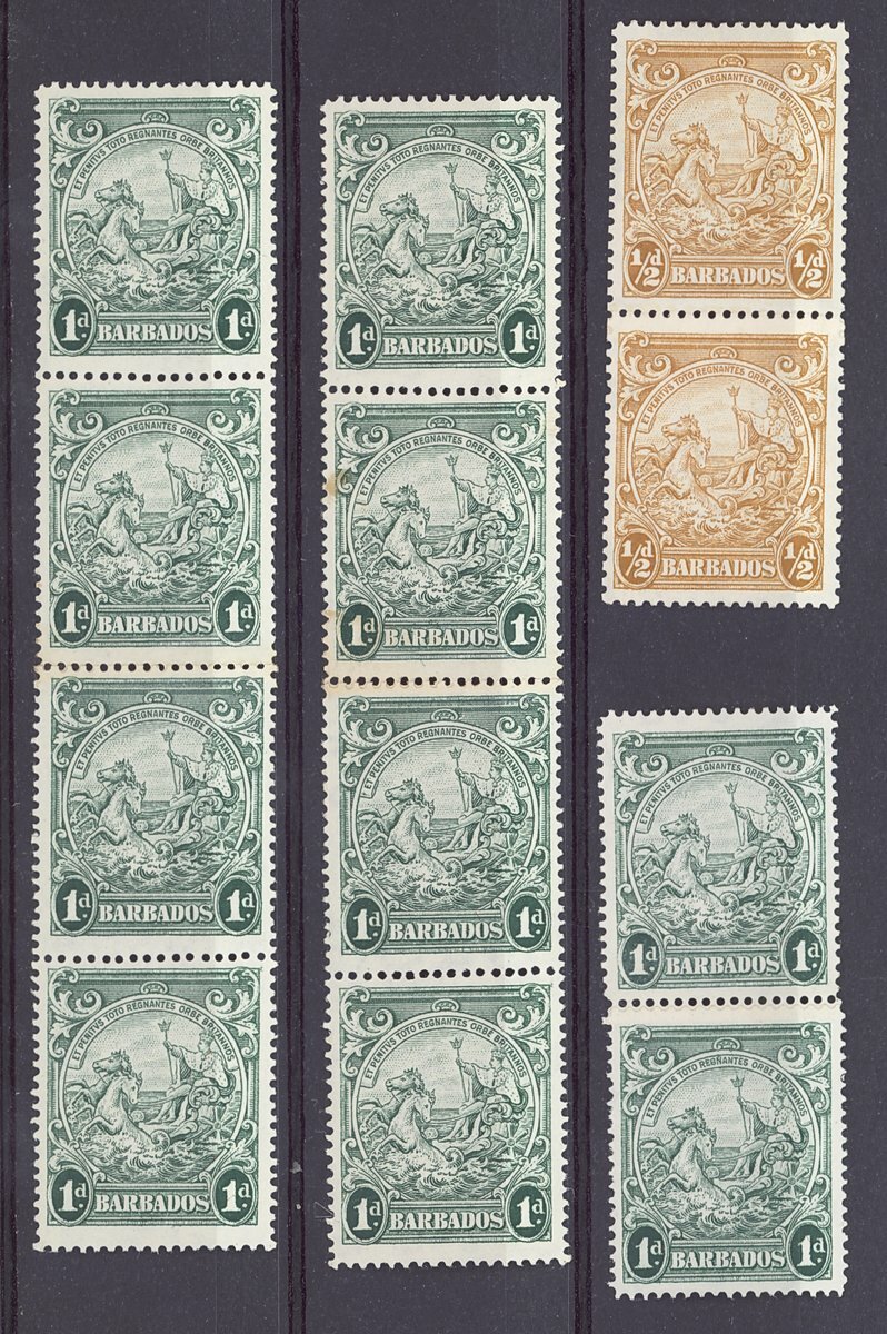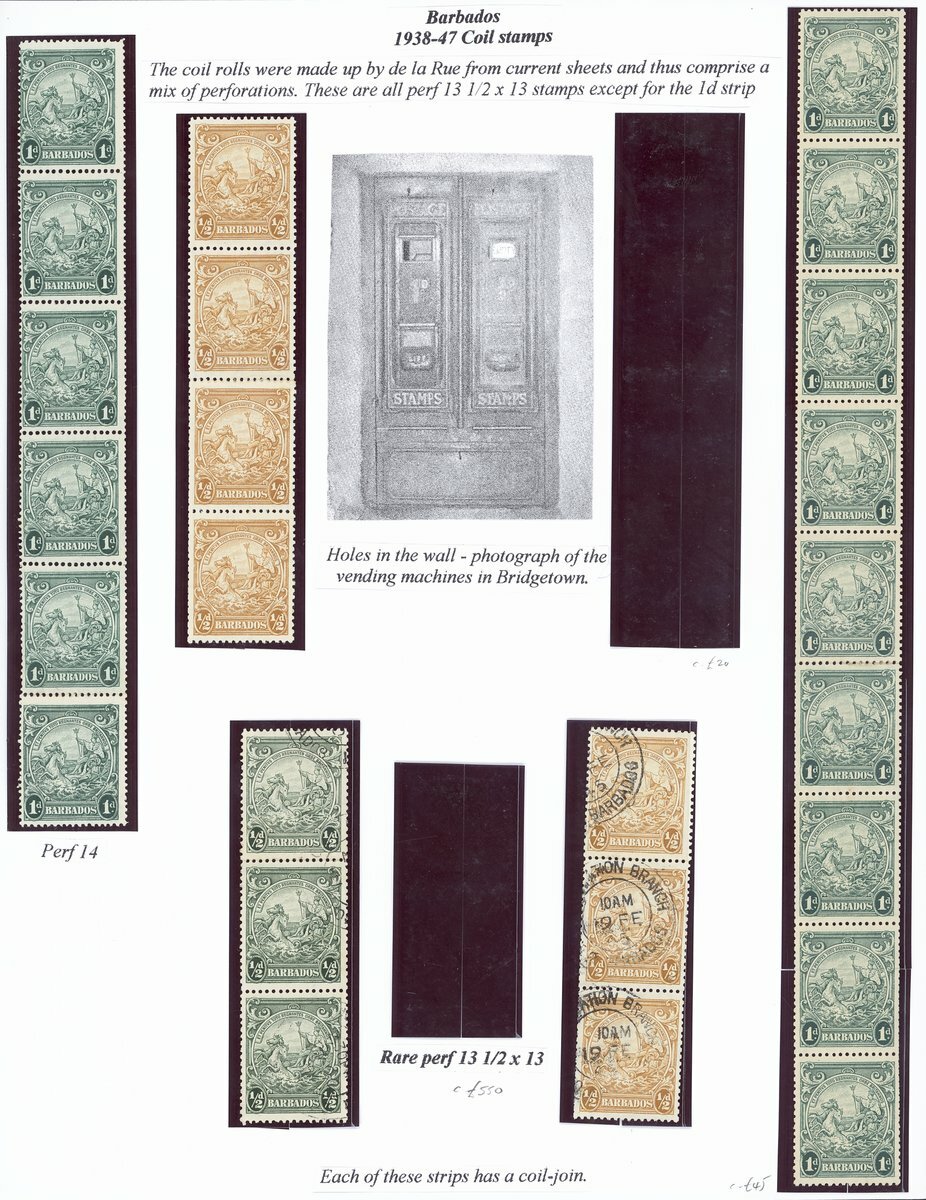 A selection of perf. 13½x13 coils (8) with joins, comprising ½d. green used strip of three, ½d. yellow-bistre mint pair and strip of four and used strip of three and 1d. blue-green pair, strips of four (2) and six and perf. 14 strip of nine, all mint; fine