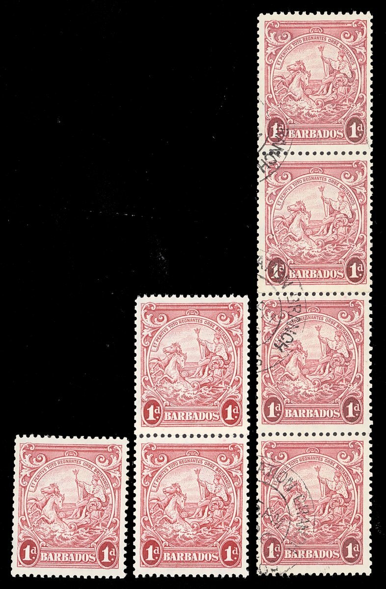 1d. scarlet perf. 13½x13 unmounted mint coil pair and used strip of four, both with join; also mint example with perfs trimmed at left indicating coil usage. S.G. 249, £845+