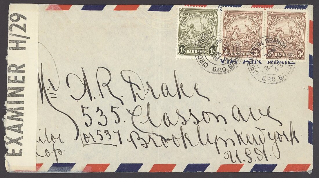 3d. brown perf. 14 pair, right-hand stamp variety vertical line over horse's head used with perf. 13½x13 1/- olive-green on 1941 (23 June) censored envelope to New York, scarce variety on cover. S.G. 252ba