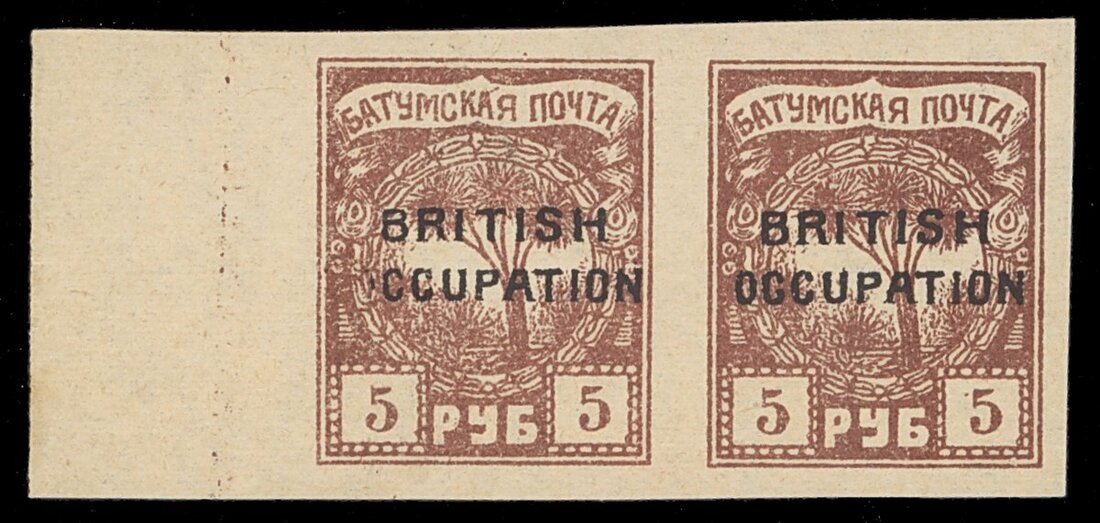 1919 (10 Nov.), 5r. brown horizontal pair with margin at left showing variety '