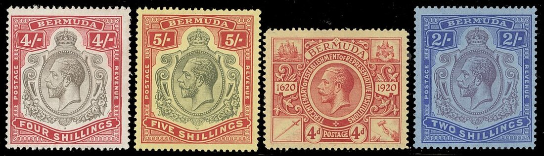 1918-22 4/- break in scroll, 5/- damaged leaf, 1921 Tercentenary 4d. watermark sideways and reversed and 1924-32 2/- broken crown and scroll, large part original gum; some minor gum bends and/or areas of toning, otherwise sound. S.G. 52bba, 53df, 71x and 88c, £1,275