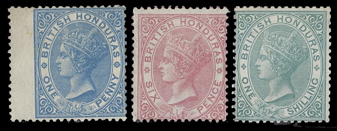 1865 1d. blue with wing-margin at left, 6d. rose and 1/- green; small to large part original gum with light even toning throughout. S.G. 2-4, £950