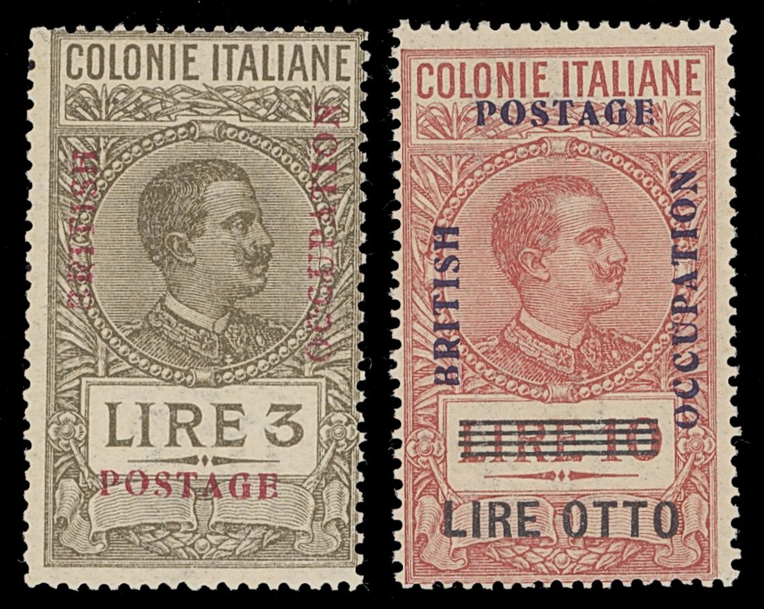 1941 Prepared for use but not issued overprints or surcharges on Italian Colonies Fiscal 3L. and 8L. on 10L., unmounted mint, fine and scarce. Both with Ceremuga Certificate (2005). Sassone 12, 16