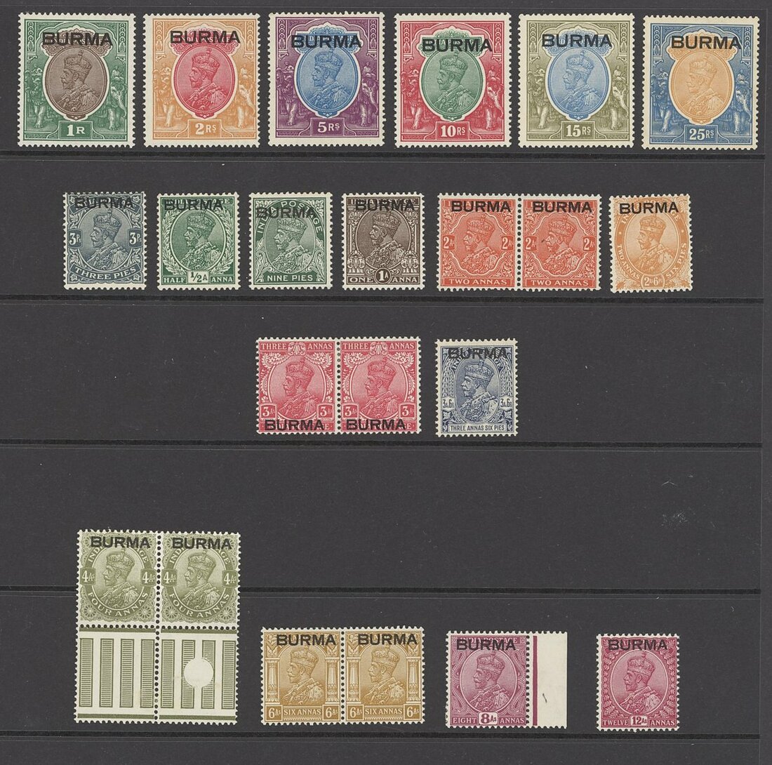 1937 lower denominations, some with wmk. inverted, some in pairs and 1r., 2r. 5r., 10r., 15r. and 25r.; large part original gum, some values with gum bends and or very minor toning. S.G. 13-18, £2,965+