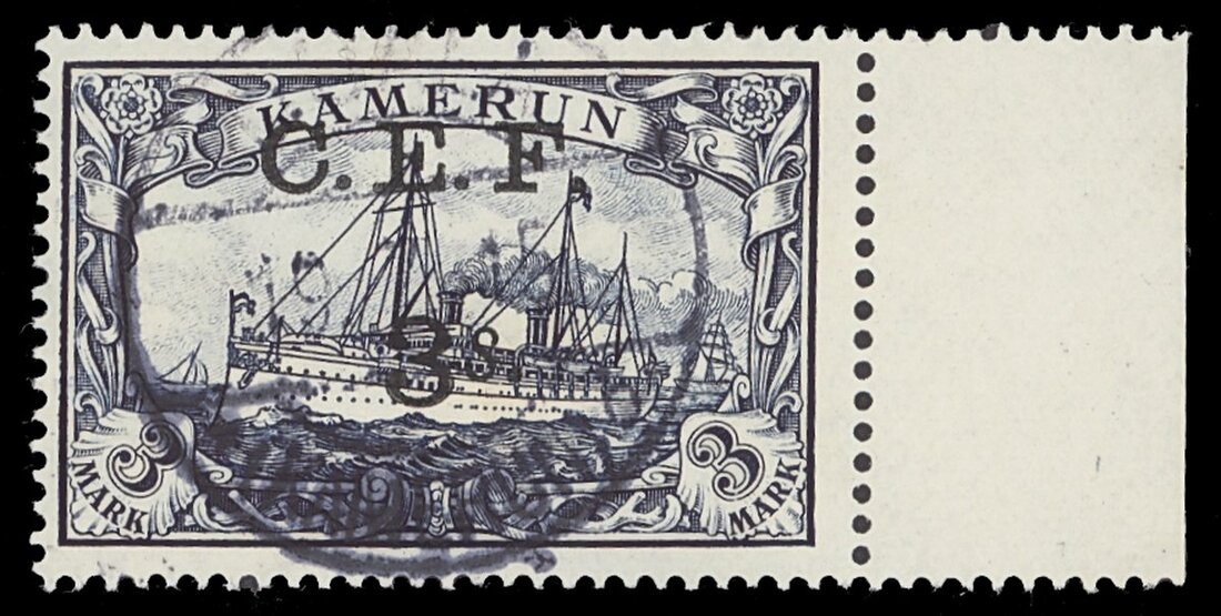 3/- on 3m. violet-black with margin at right, cancelled by unclear Kamerun datestamp; cancel off-setting and '