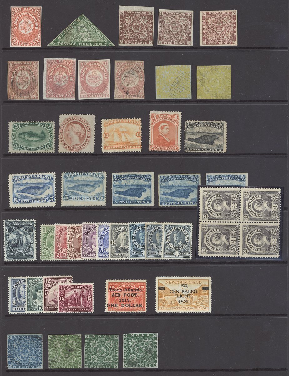 1851-1933 group including New Brunswick 1851-60 6d. yellow and olive-yellow, both used and cut-into, Newfoundland 1857-64 6½d. re-gummed and repaired, indistinct mesh 3d. used (faults), 1857-64 5d. unused (3, shades), 1865 thin paper 2c. and 12c. (both with faults), 1876-79 5c. blue (3), 1880-82 5c. (bend), 1890 3c. block of four, 1933 Balbo Flight $4.50 on 75c., Nova Scotia 1851-60 with 6d. deep green used (tear); mixed condition. A valuable lot. Cat. £8,000+