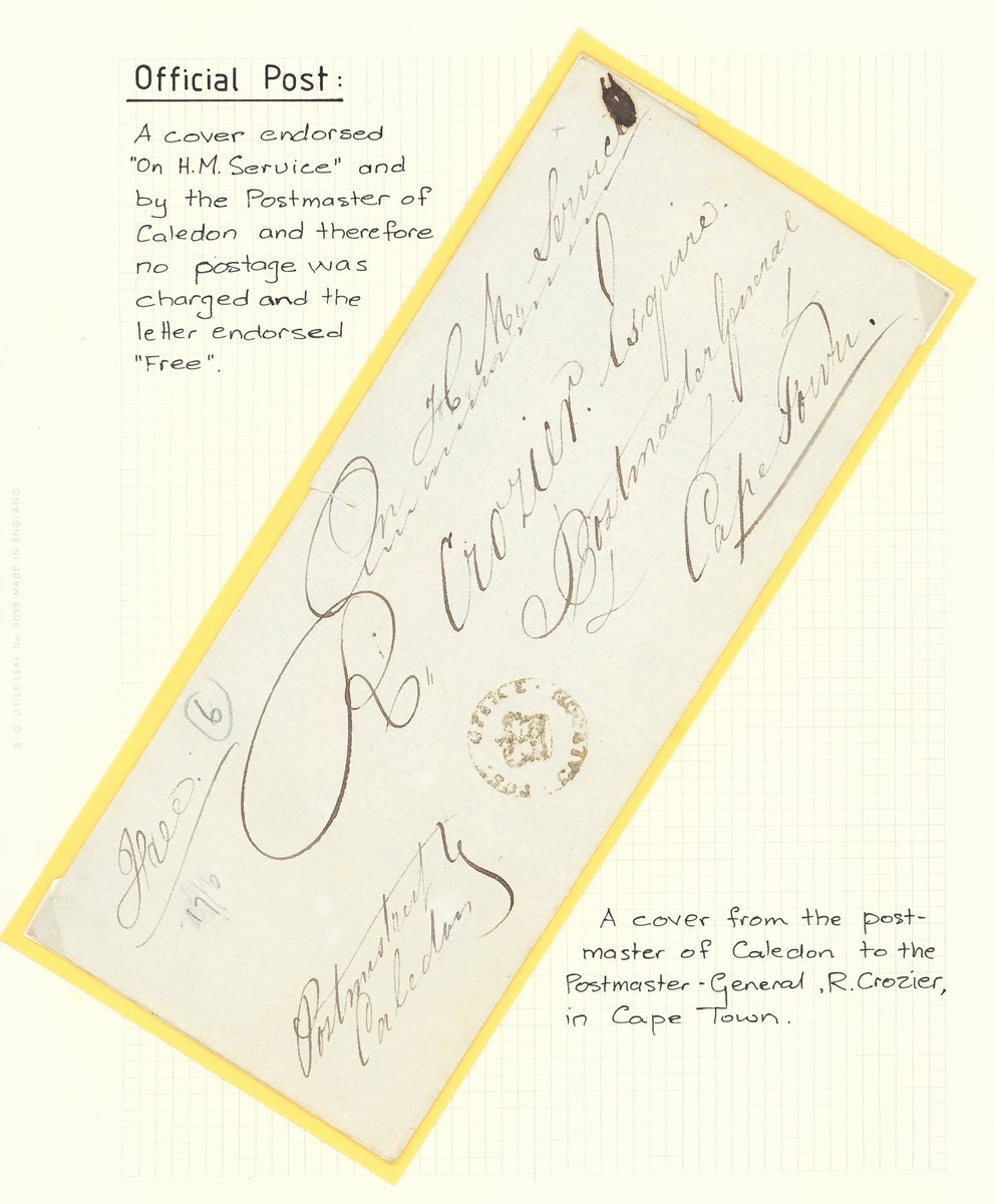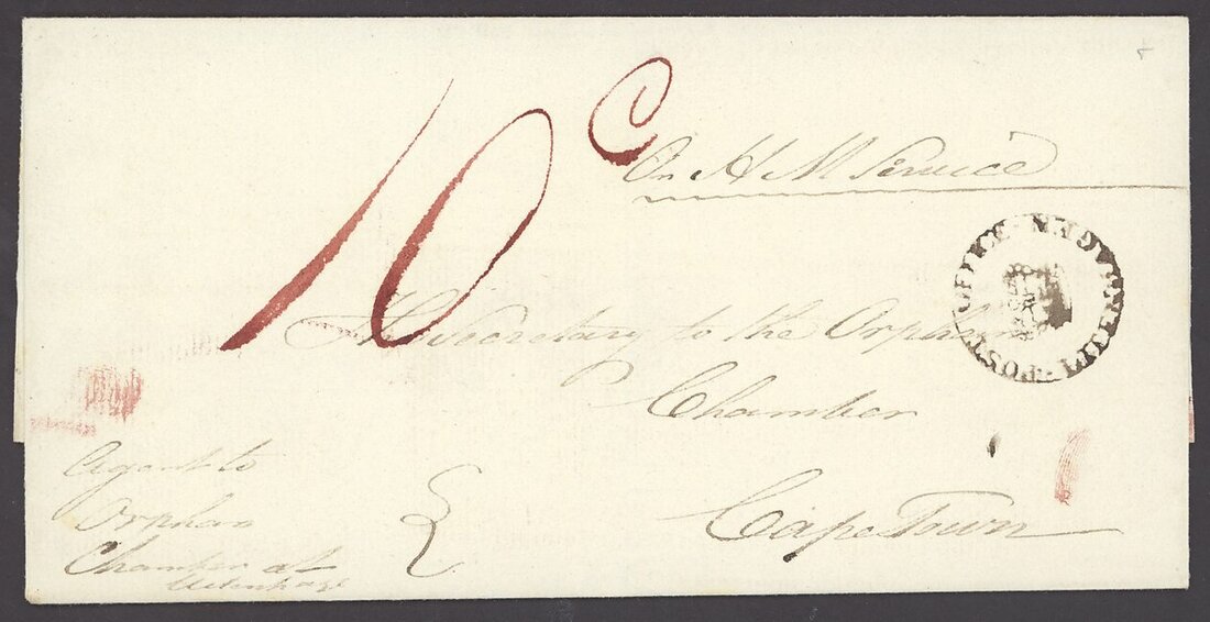A quartet of Official mail, two to Cape Town with Crown in circle handstamps of Caledon and Uitenhagen with the latter charged "10c" in red ink, one from Simons Town to Cape Town with Crown in circle handstamps of both and 1837 with a printed address from the Master's Office at Cape Town to Colesburg rated "1/2" with Crowned "