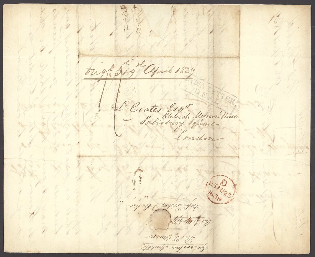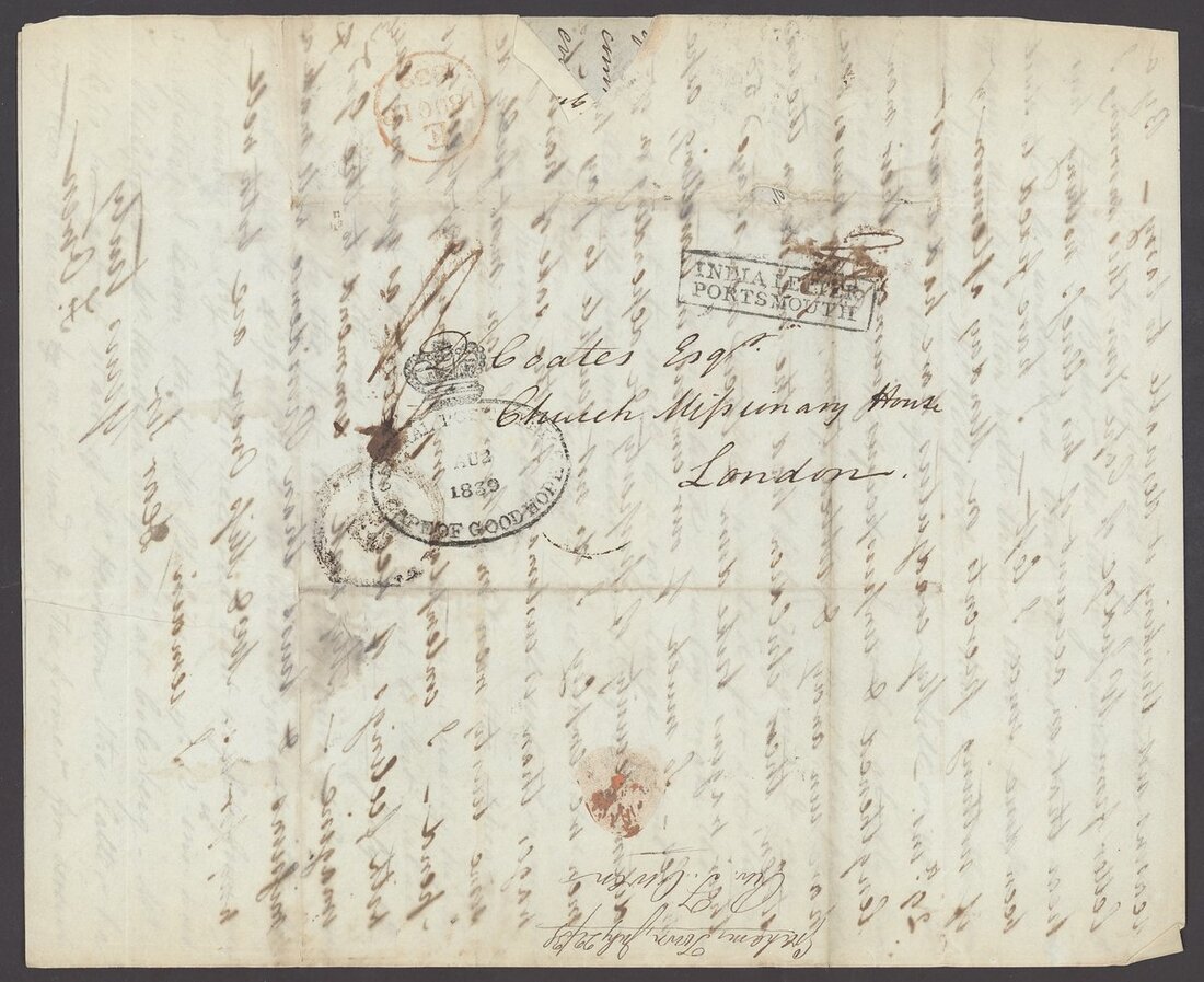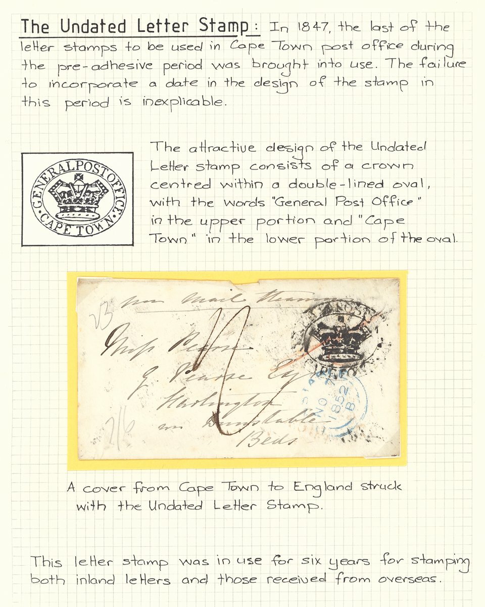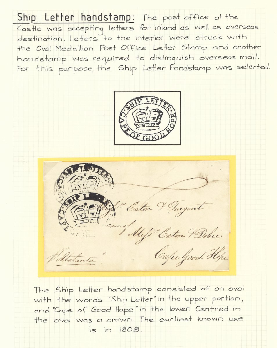 1825 entire and 1846 envelope both to the Cape with London Ship Letter handstamps, 1839-41 entire letters from Grahamstown (3) and 1852 envelope from Cape Town, two with Deal or Portsmouth India Letter handstamps; also undated entire with two strikes of the "