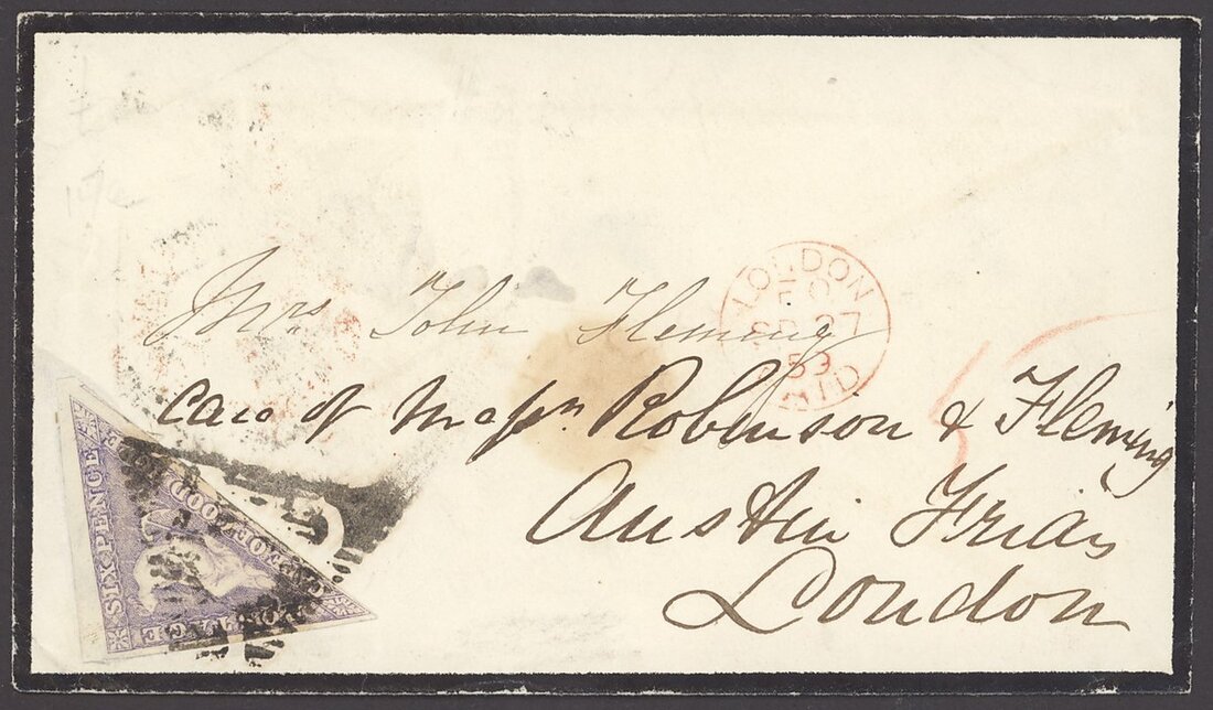 1859 (20 Aug.) mourning envelope from Cape Town to London, bearing 6d. rose-lilac with just clear to enormous margins, clearly cancelled and tied, showing manuscript accountancy "5" and London Paid datestamp (27.9) at centre, despatch datestamp on reverse