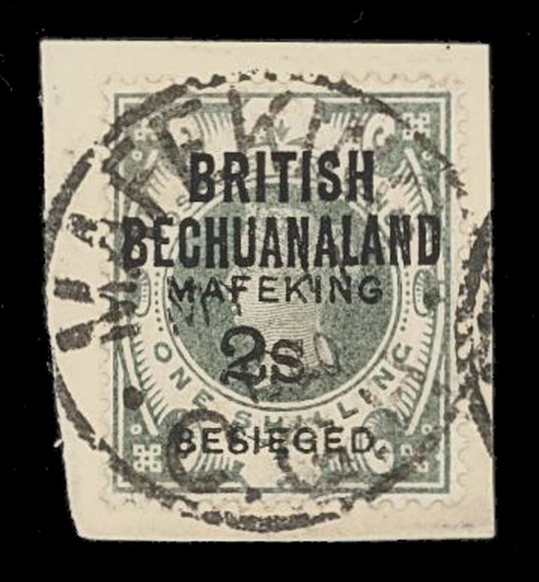 British Bechuanaland 2/- on 1/- green tied on small piece. Fine. S.G. 16, £650