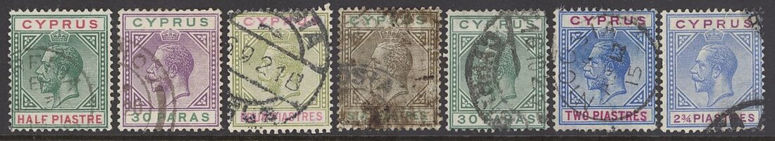 1912-15 ½pa., 30pa., 4pi. and 6pi., 1921-23 30p., 2pi. blue and purple and 2¾pi., all variety "Broken lower left triangle", used, mixed condition. S.G. 55ba, 76ba, 79a, 80a, 87a, 92a, 94a.