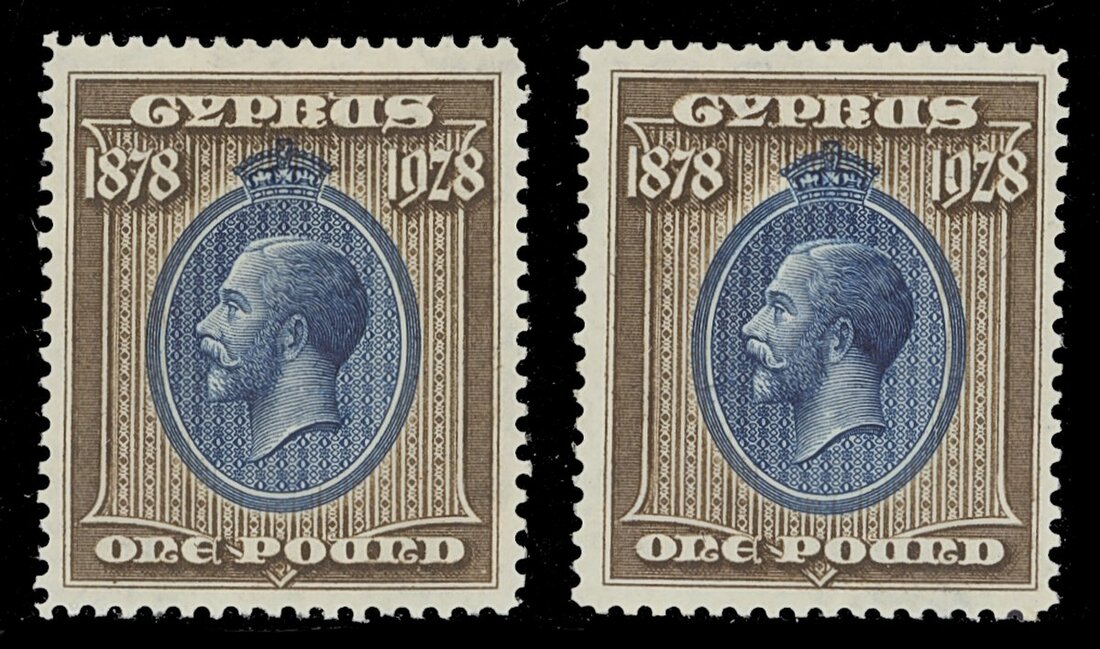 1928 50th Anniversary £1 blue and bistre-brown, two examples, both with large part original gum. S.G. 132, £450