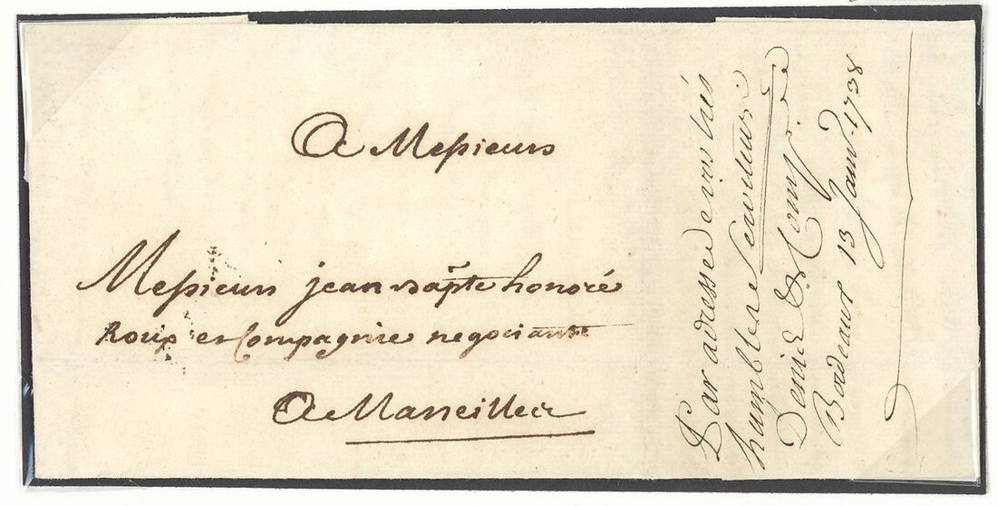 1737 (17 Nov.) entire letter to Marseilles showing, on reverse , manuscript "Par Adresser Votres Humble Servitur Denise & Comp. Bordeaux 13 Jany. 1738" forwarding agent's endorsement; fine. Photo