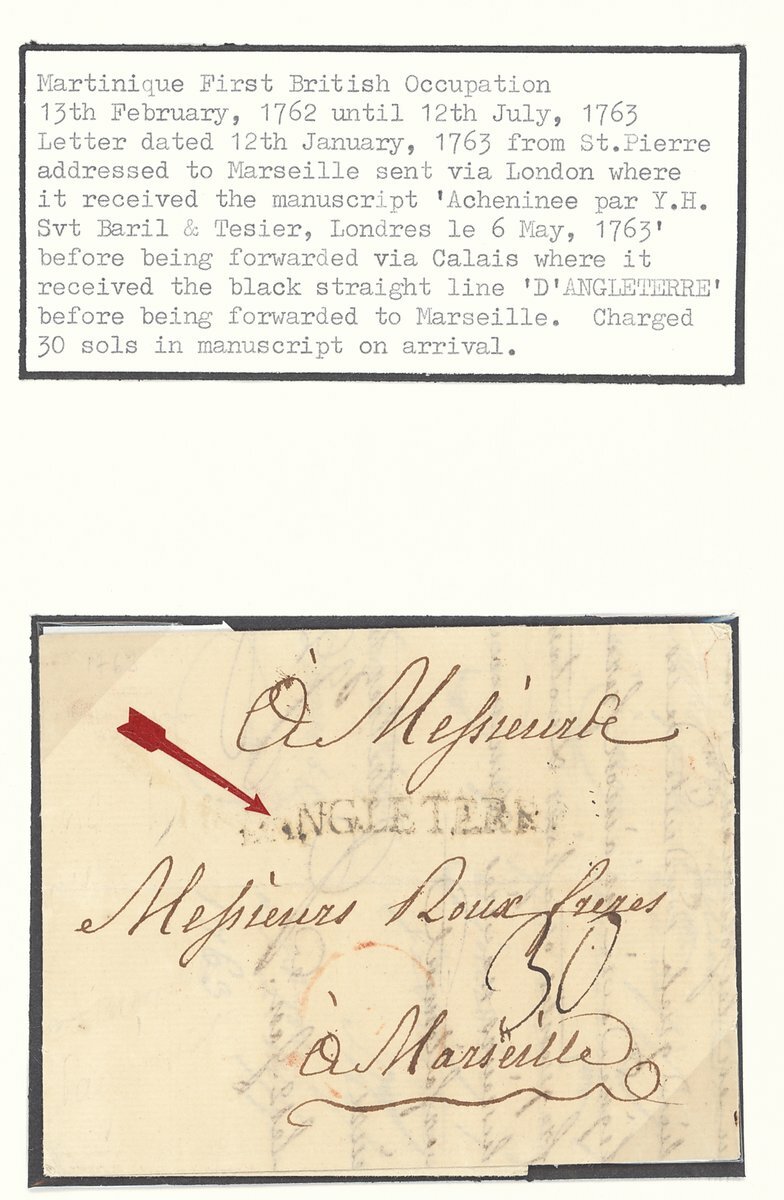 1763 (12 Jan.) entire letter from St. Pierre via London to Marseilles, showing manuscript "Acheninee par Y.H. Svt.Baril & Tesier, Londres le 6 May 1863" before being forwarded to Calais where it received straight-line