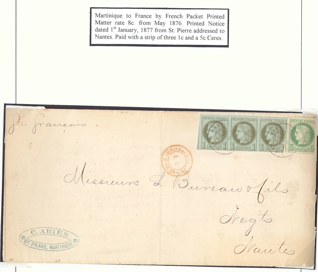 1877 (1 Jan.) large entire printed notice from St. Pierre to Nantes, bearing 1872-77 1c. strip of three, cut into at right, and 5c. single, tied by despatch c.d.s., showing French entry in red alongside, backstamped on arrival. A very rare example of this 8c. printed matter UPU rate, which was applied during the short period from July 1876 to April 1879. Maury 14, 17. Also