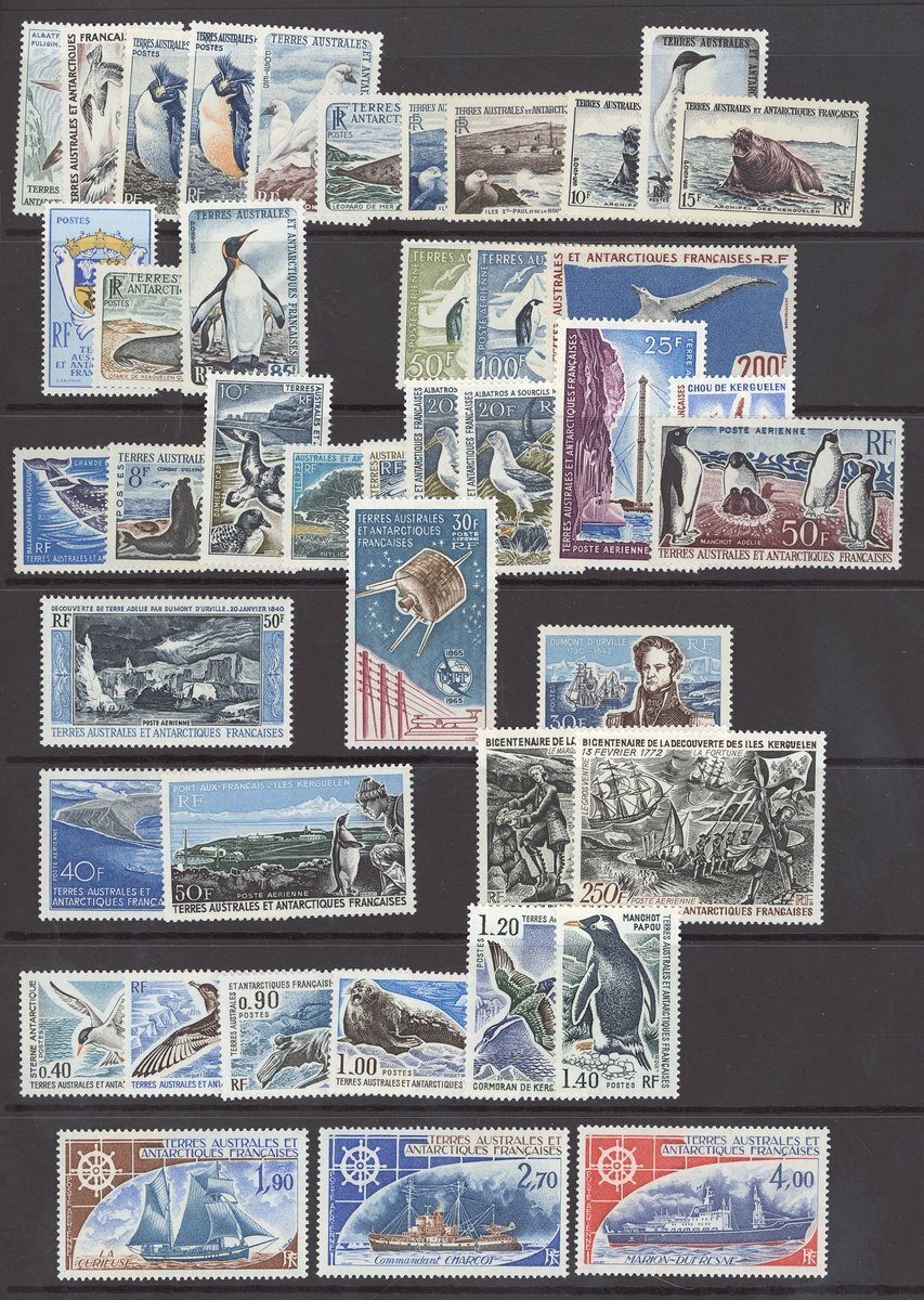 1956-76 mint selection (43), including 1956-60 Postage and Air set, 1962-72 5f. to 50f. (with additional 20f.), 1965 Adele Land 50f.,1965 I.T.U. 30f.,1968 Dumont 30f., 1968-69 Air 40f. and 50f., 1972 Crozet Islands 100f., 250f., 1976 Postage and Air set, mint, mostly unmounted, chiefly fine