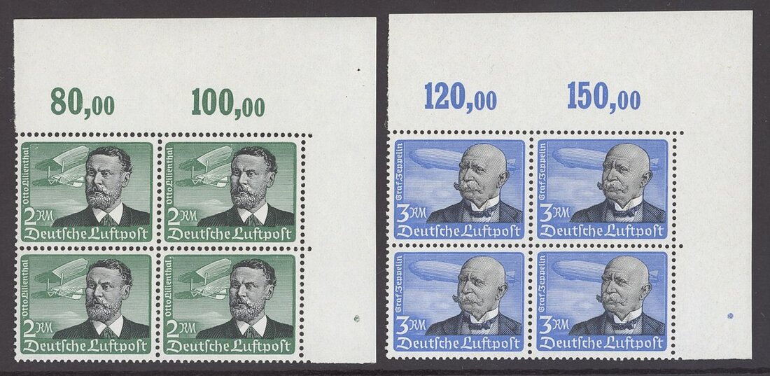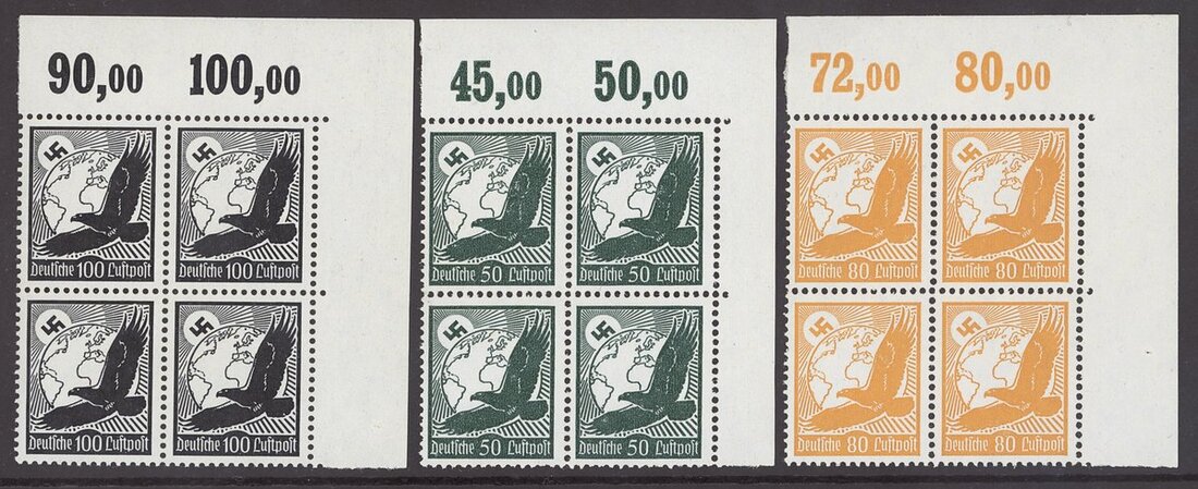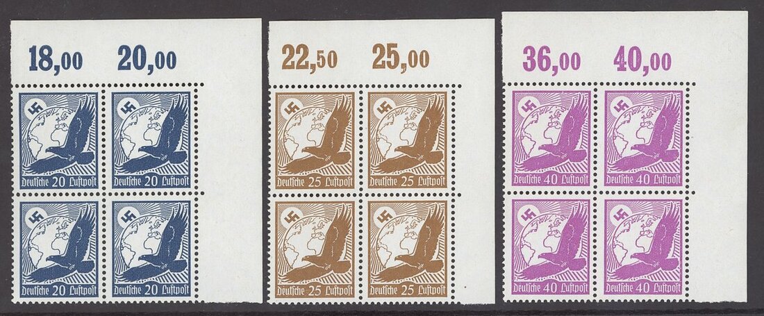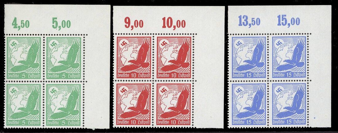 1934 Air 5pf. to 3m., the set of eleven in unmounted mint blocks of four from the upper-right corners of the sheets; a few minor bends or wrinkles, fine and fresh. S.G. 525-536, £3,600+. Photo
