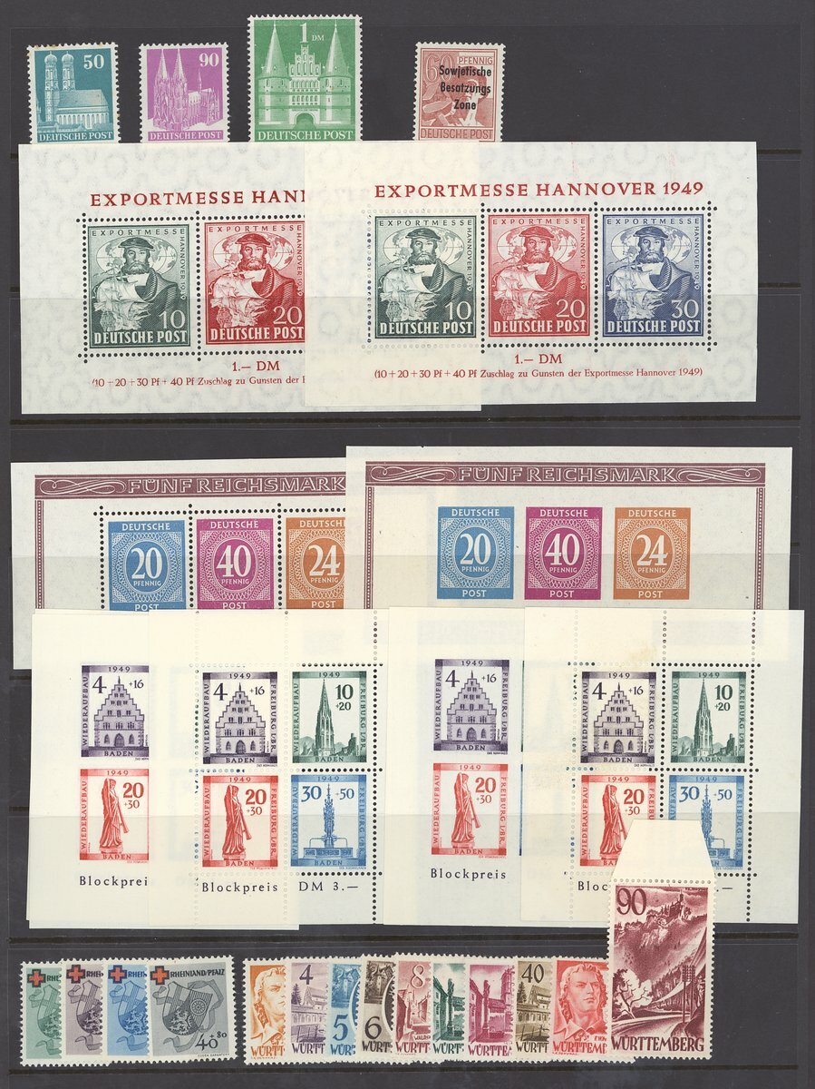 Mint selection (27) on stockpage, including British and American Zones 1946-47 perf. and imperf. miniature sheets, 1948-50 Buildings 50pf. and 90f. perf. 14, 1m., 1949 Hanover Fair miniature sheet (2), French Zones Baden 1949 Freiburg miniature sheet imperf. (3) and perf. (2), Rhineland Palatinate 1948-49 2pf. to 90pf., Wurttemberg 1949 Red Cross set, etc., unmounted mint or part original gum; chiefly fine