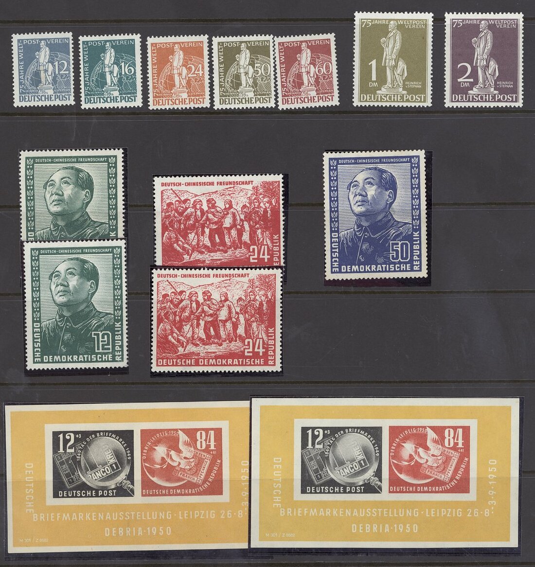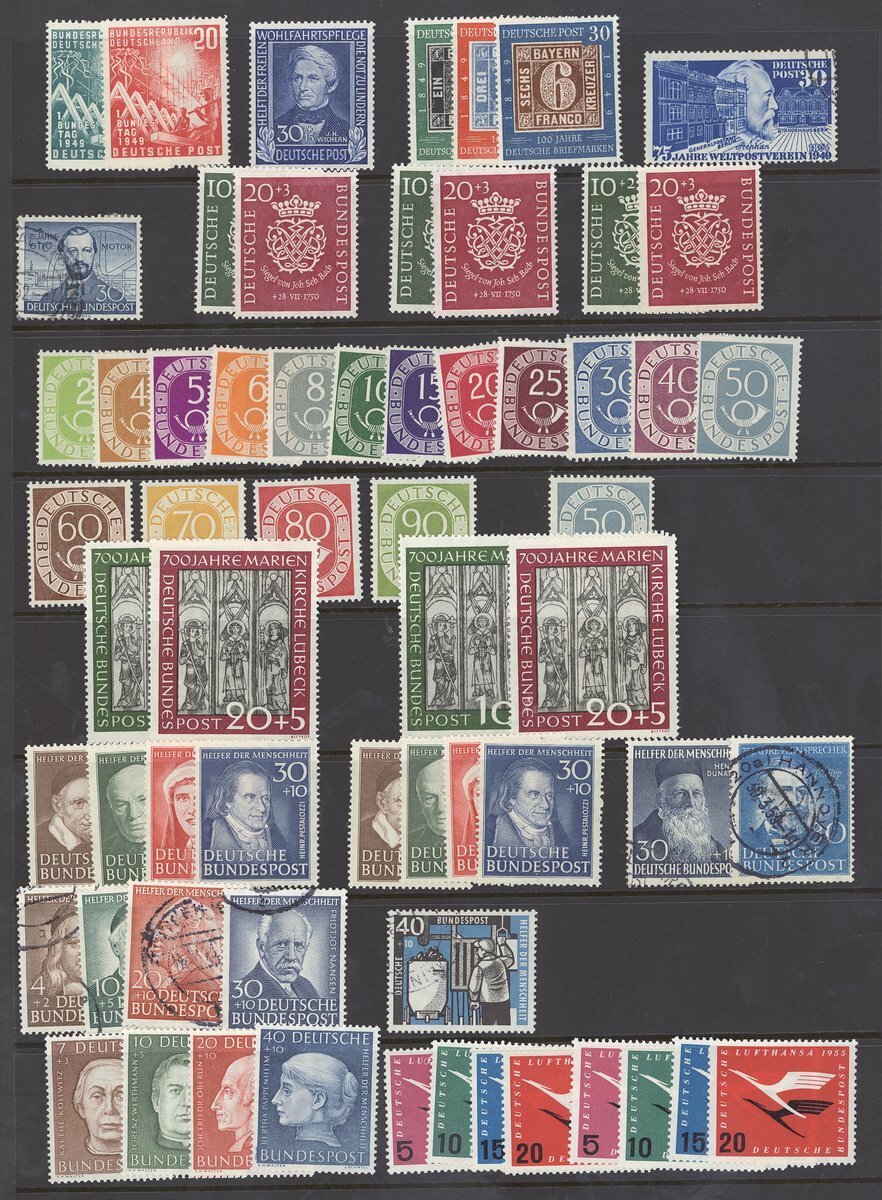 1949-55 mint and used selection (62) on stockpages, including 1949 Parliament, 1949 Stamp Centenary, 1950 Bach (3 sets), 1951-52 Posthorn set, 1951 St. Mary's Church (2 sets), etc., also Berlin 1949 U.P.U. set, East Germany 1950 Debria miniature sheet (2), 1951 China Friendship set, etc., mixed condition