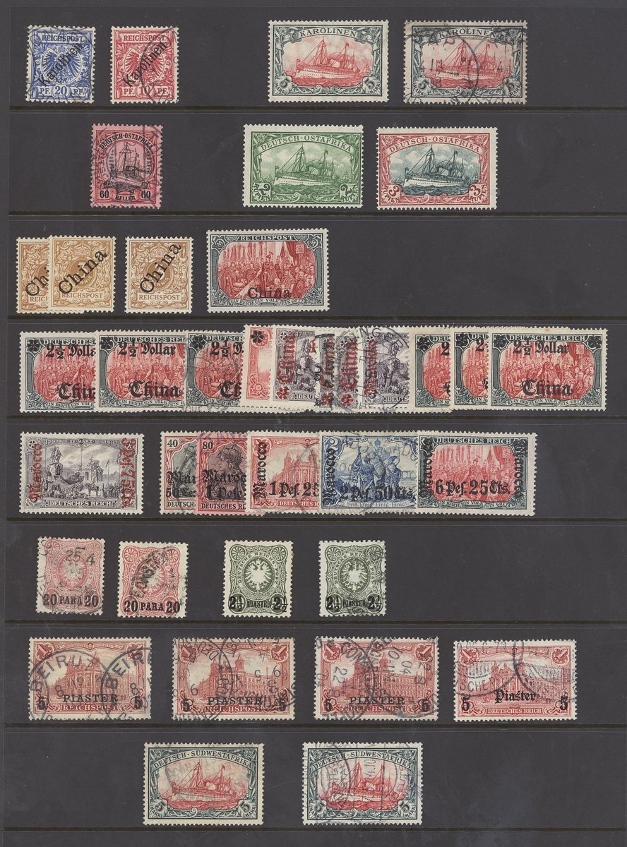 Mint and used selection (60) on stockpage, including Caroline Islands 1899-1900 48 degree overprint 10pf., 20pf., 1901-10 5m. part original gum and used, German East Africa 1905 60h., Post Offices in China 1898 48 degree 3pf. (2), 1901-04 5m., 105 no watermark 2½d. on 5m. (2 mint, one used), 1905-19 1½d. on 3m. (2 used), 2½d. on 5m. (3), Post Offices in Morocco 1906-11 40c. on 40pf., 1p. on 80pf., 6p. 25 on 5m., Post Offices in the Turkish Empire 1884 2½pi. on 50pf., 1902-04 5pi. on 1m. (3), German South West Africa 19-6-19 5m. (2), Kiaochow 1901 1m., 2m., 3m. and 5m., 1905-18 1½d. (3), 2½d., Mariana Islands 10-1 2m., 3m., Marshall Islands 1897-1900 "Marschall-Inseln" 5pf., 20pf., 1901 3m., Samoa 1900-01 2m. (2), 3m. (2), 5m. (original gum and used), etc., chiefly good to fine
