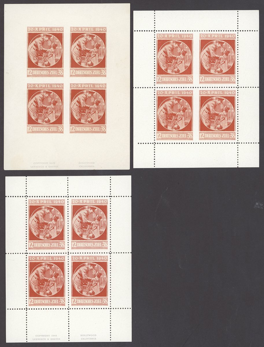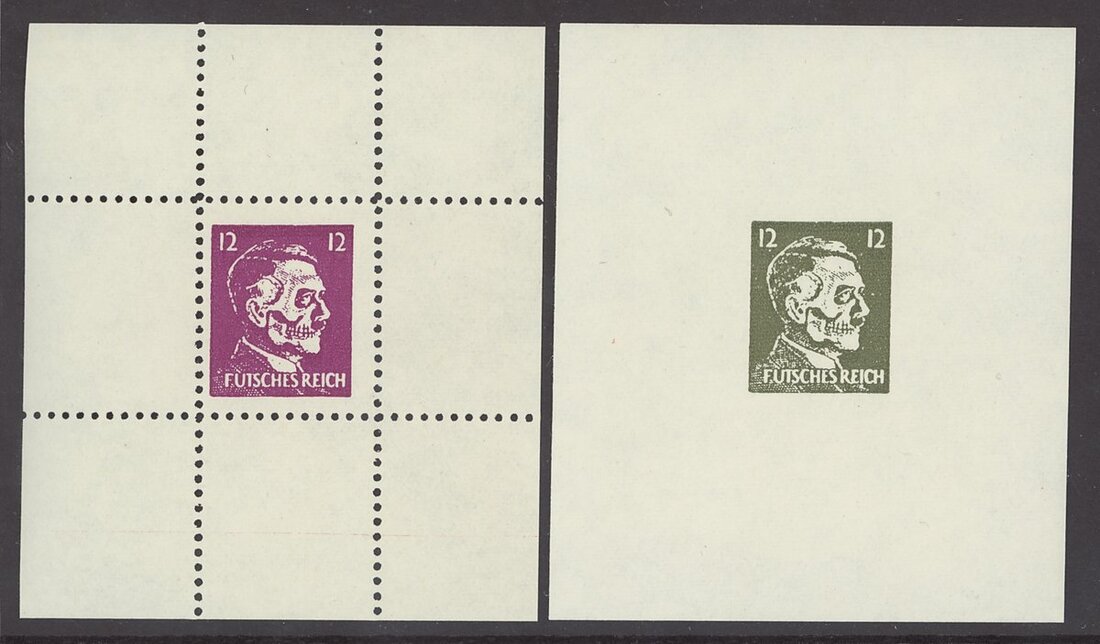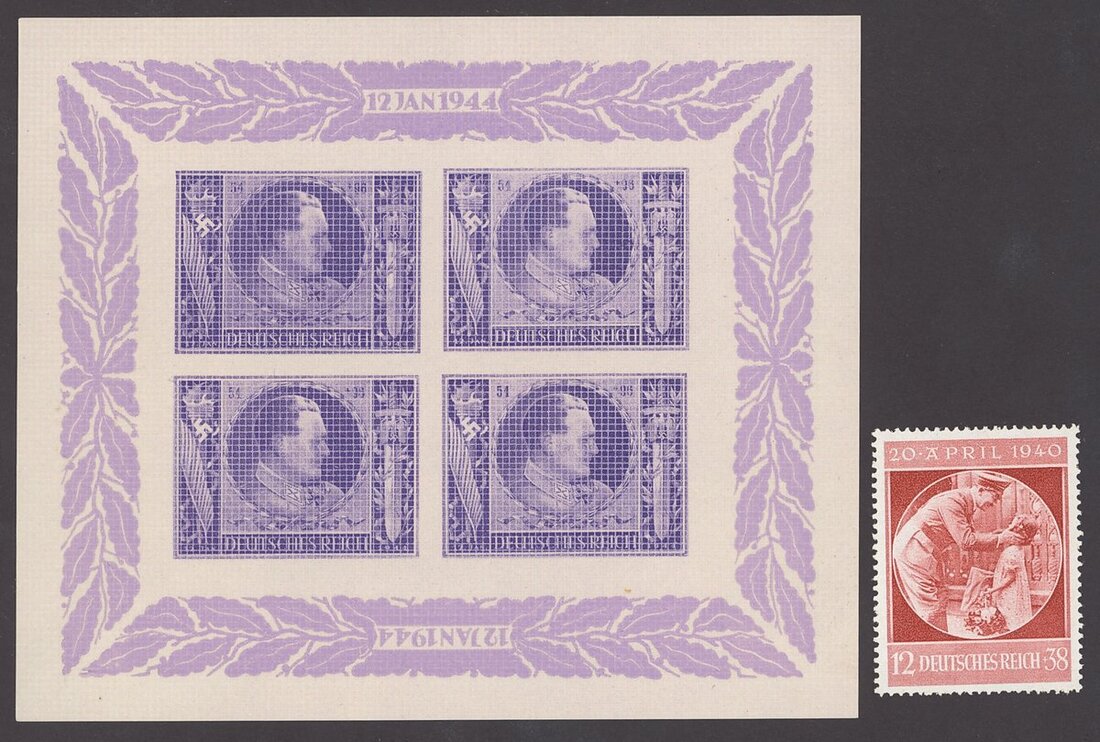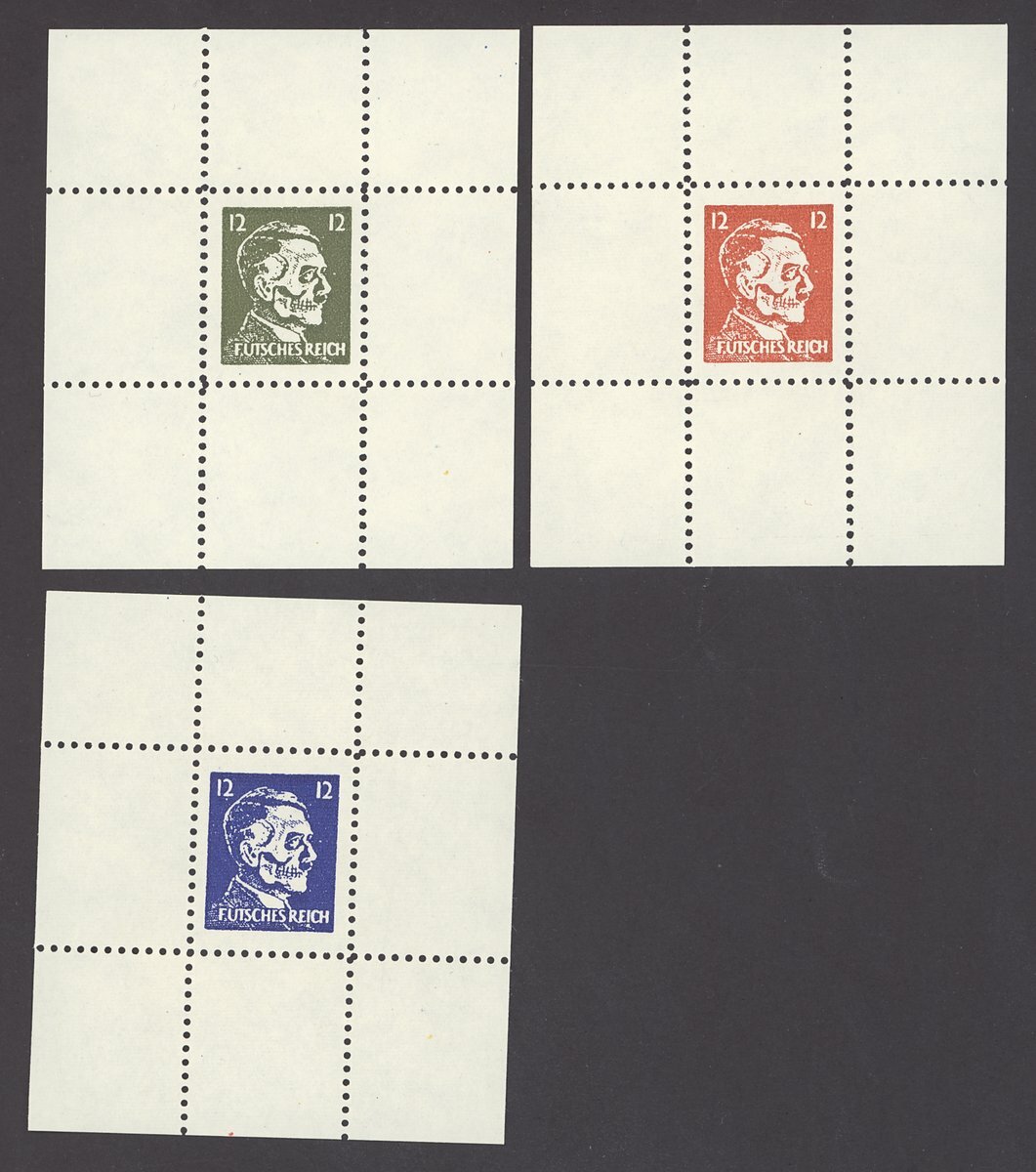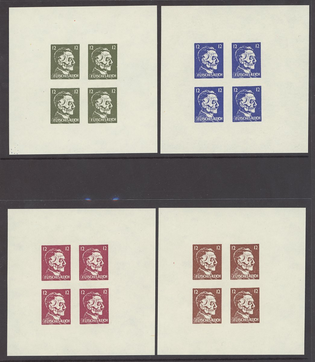 Forgeries: Selection including German Propaganda forgeries of Great Britain 1935 Jubilee ½d. and 1937 Coronation 1½d. on sheet, "Spitler" sheet of 4 imperf., perf. sheet and sheet imperf. between vertically, Goering behind bars imperf. sheet of 4, Hitler Skull forgeries of the forgery, Theresienstadt Parcel Admission labels, (five numbered imperf. sheets of four in different colours), etc., chiefly good to fine