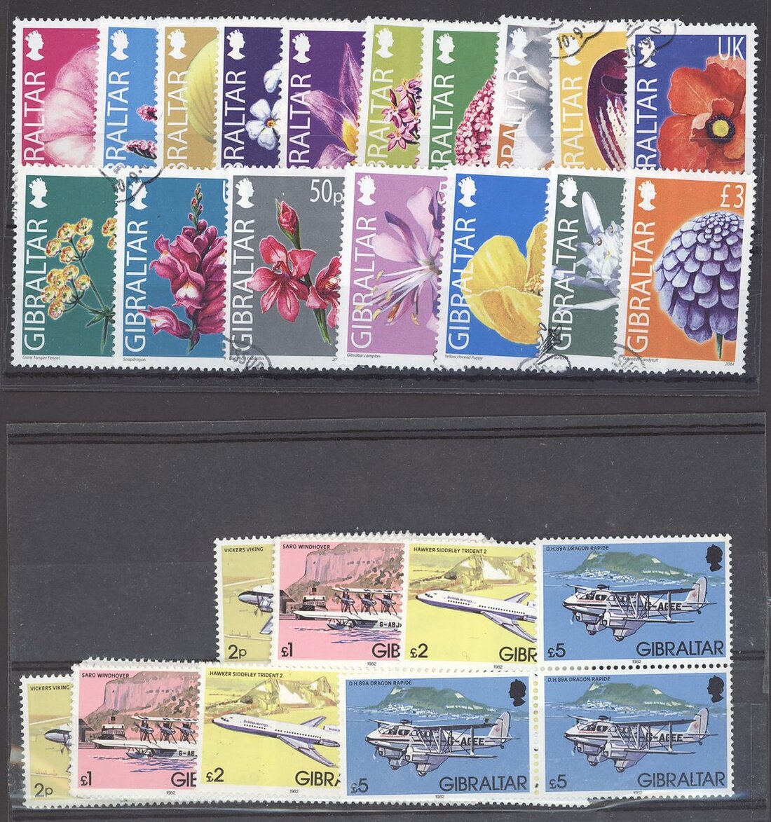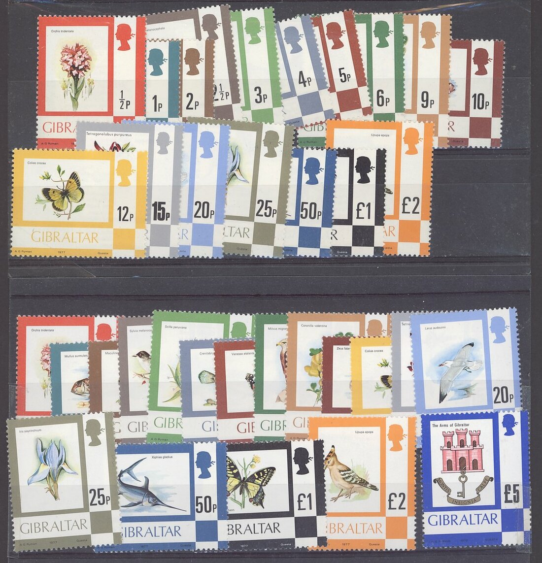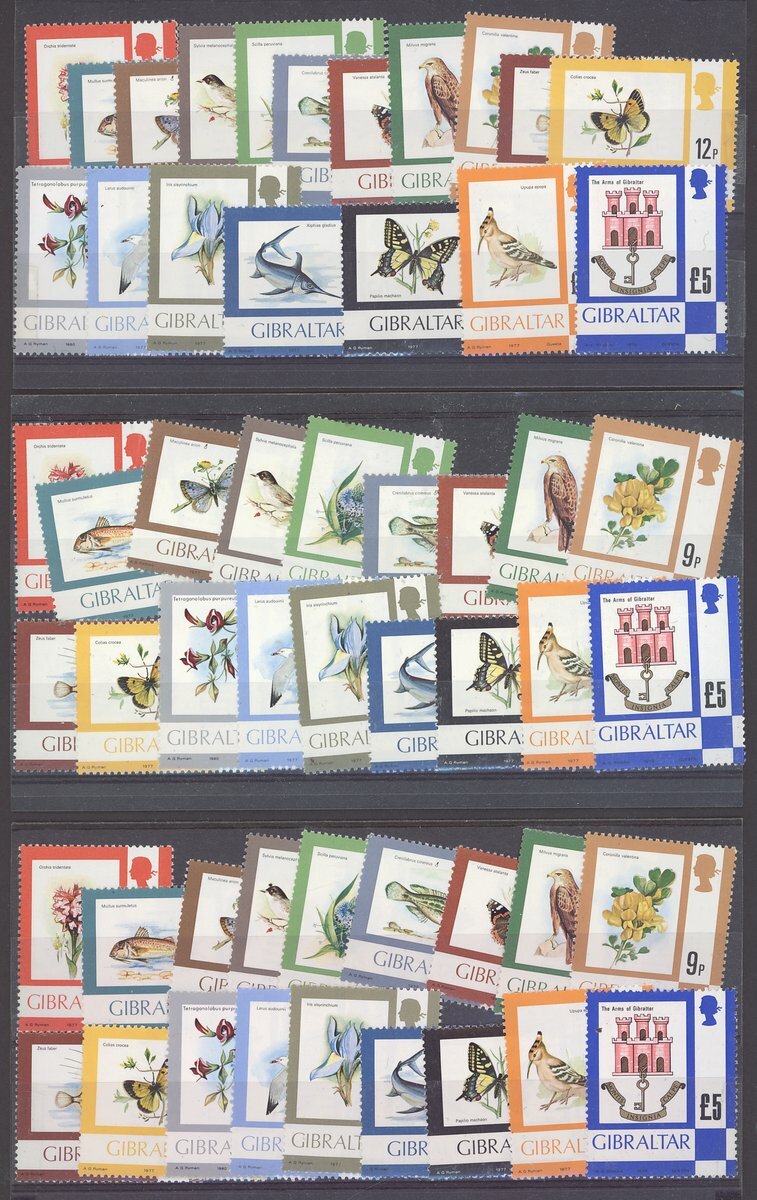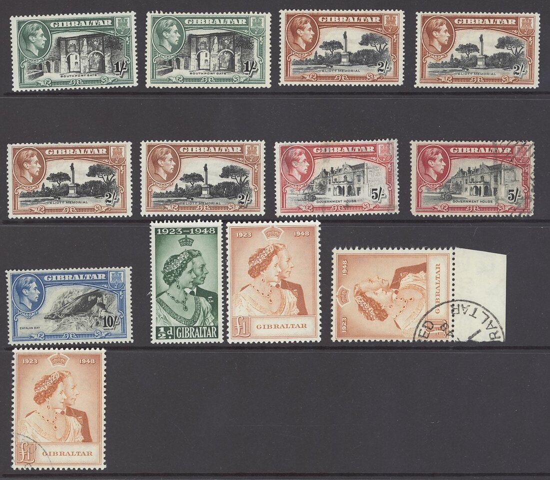 1886-QEII including 1886 4d. and 1/- (doubtful overprints), 1886-87 various values with 1/- (2, both with faults), 1889-96 5p. used (2), 1903 2/- and 4/- (2), 1904-08 2/- mint and used, 4/- used and £1, 1906-11 4/- mint and used and 8/-, 1912-24 8/- and £1 (2, both with surface abrasions), 1925-32 £1 and £5 used (doubtful cancel, possibly covering fault), 1938-51 1½d. perf. 13½ (2), 3d. perf. 14, 6d. perf. 14 (3), 2/- perf. 13½ (2) and further QEII sets on stock cards. Condition mostly good, though some with faults S.G. c.£5,500 (not including £5)