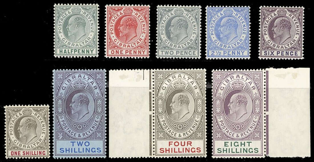 1906-11 ½d. to 8/-, the 4/- and 8/- marginal from left and right of the sheet respectively; high values very lightly mounted. Fine. S.G. 66-74, £650