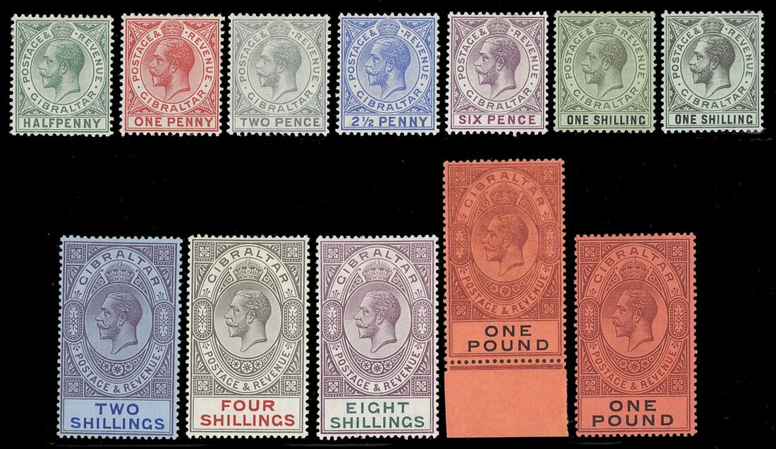 1912-24 MCA set to £1 including 1/- (2, one on emerald surface) and an additional £1 value; fine and fresh with large part original gum. S.G. 76-85, £495