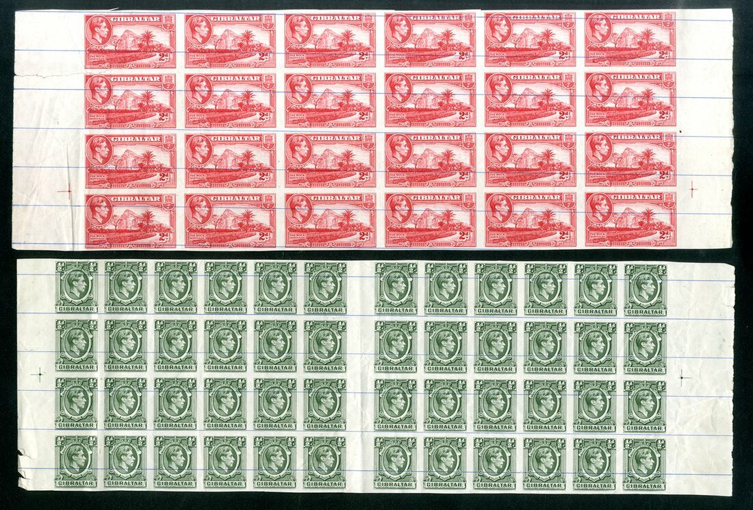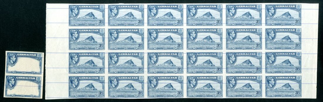 1938-51 ½d. deep green marginal interpanneau block of forty-eight (12x4), 2d. carmine (creases) and 3d. light blue marginal blocks of twenty-four (6x4), all imperforate plate proofs on thin unwatermarked paper with thin blue horizontal ruled lines across face, also 3d. frame only in blue vertical pair on thin unwatermarked paper with ruled lines across face. Some faults though a nice group.