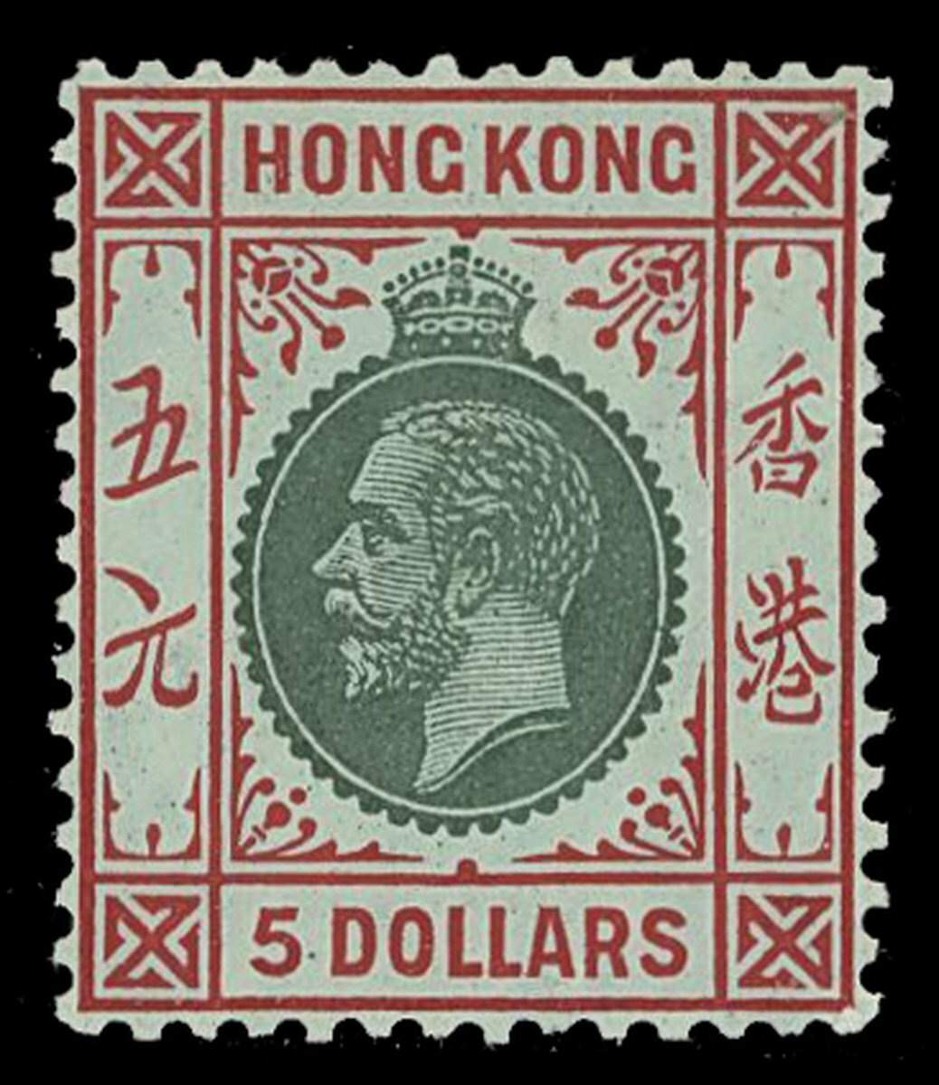 1912-21 $5 green and red on green with white back, part original gum and of fresh appearance. S.G. 115a, £600