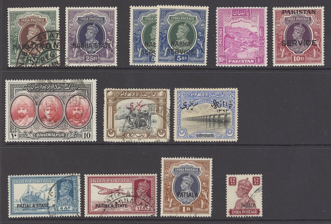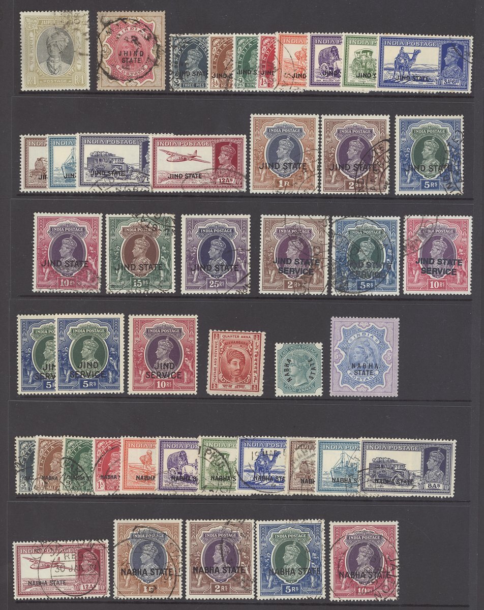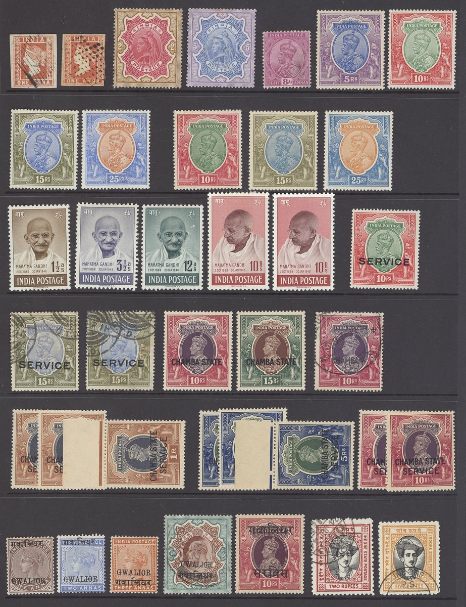 1854-1948 selection on three stock pages including 1854 1a. used (2, one with large margins), 1895 2r. and 5r. (both with faults), 1911-23 5r., 10r., 15r. and 25r., 1926-33 10r. (faults), 15r. and 25r., 1948 Gandhi set of four with additional 10r. (one heavily, the other lightly mounted), Official 1912-23 10r. unused and 15r. (2, used); Convention States Chamba 1938 10r. and 15r., Officials 1938-40 5r. (3) and 10r. (2), Gwalior 1885-97 1a. and 2a., Jind 2r. used (doubtful), 1937-38 set of 18, used (likely with forged cancells), Nabha 1938 set of 18, used (likely with forged cancells), some Feudatory States. Mixed condition with some overprints or cancels dubious, nevertheless high potential catalogue value well over £4,000