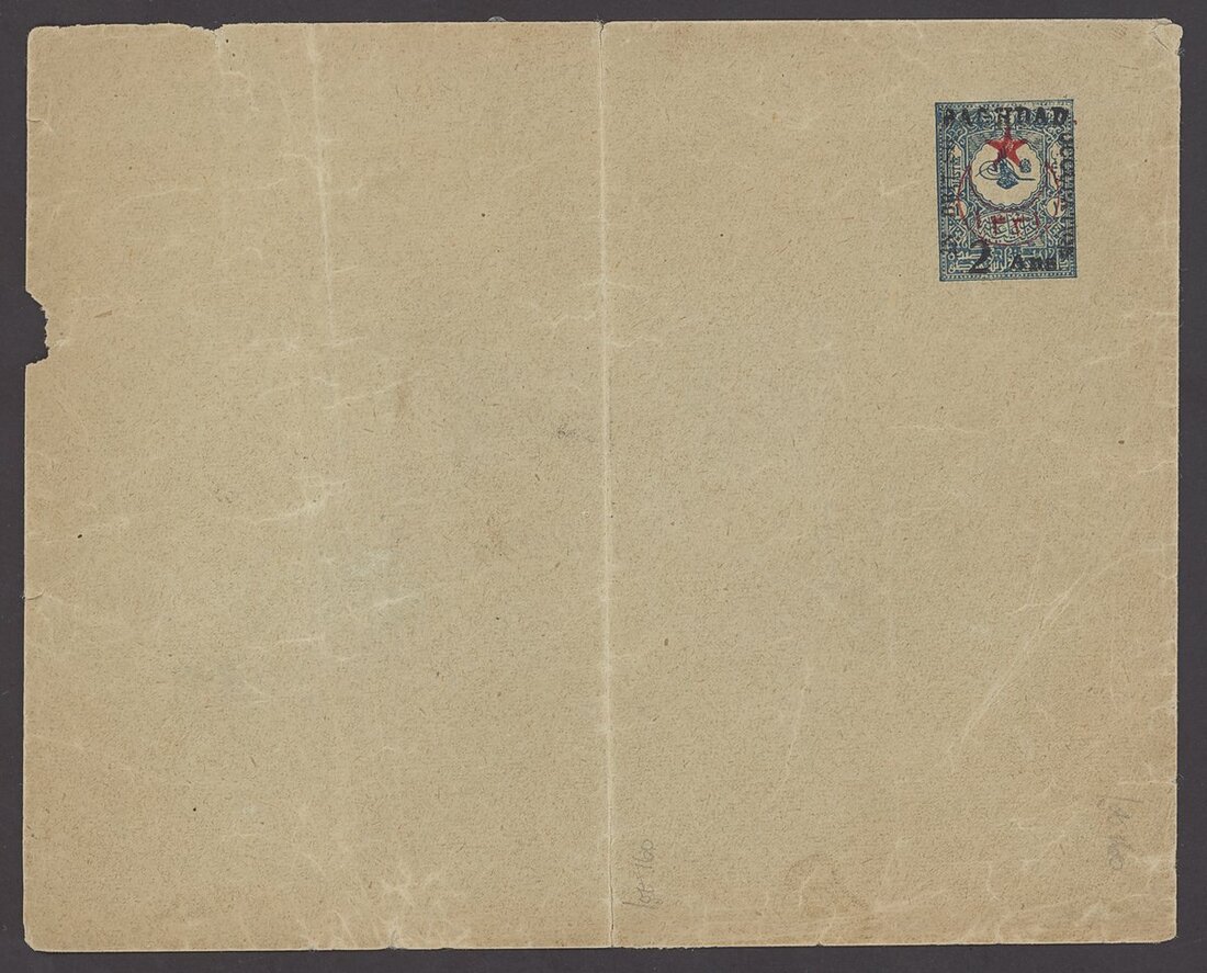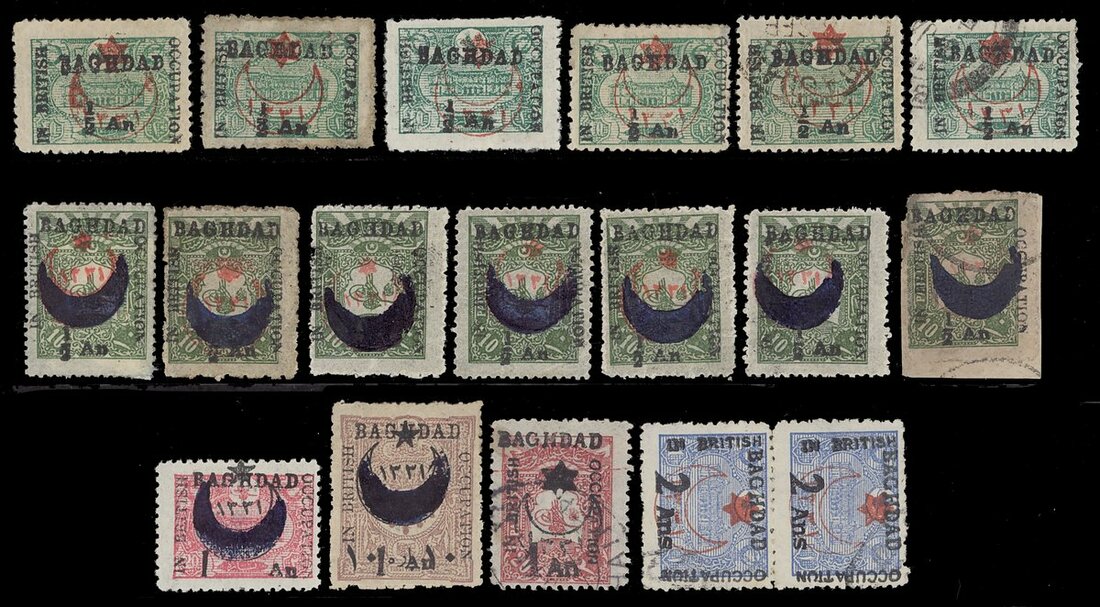 Selection comprising Six Pointed Star and Arabic date within Crescent ½a. on 10pa. green (4 part original gum or unused and two used), Date between Star and Crescent ½a. on 10pa. grey-green (6 part original gum and another (defective) used on piece), 1a. on G.P.O. Constantinople 20pa. rose (fine mint), 1a. on 10pa. on 20pa. claret (original gum), also 2a. on 1pi. postal stationery envelope (unused, creased and faults); mixed condition. Also 3 forgeries. S.G. 13, 19, 21, 23, £6,400
