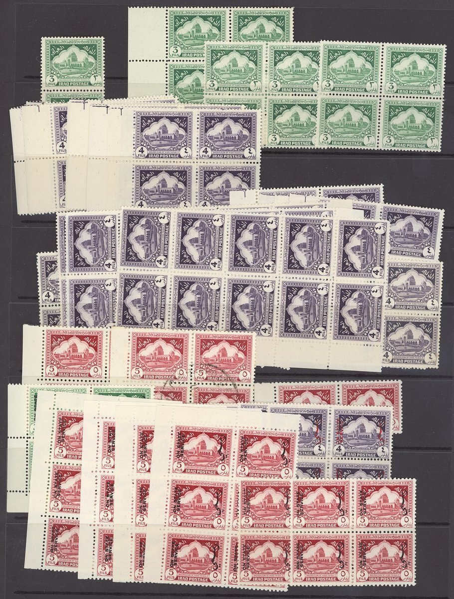 1941-47 3f. emerald, re-entry in top inscription (4 contained in pairs or blocks of four), 4f. violet, re-entry in top inscription (16 contained in blocks of four from the left of the sheet, another 5 of the same variety in blocks of 4 or 3, block of four three blocks of six and three blocks of ten, each containing two of the variety, 5f. lake, re-entry in top inscription contained in a pair and a block of four, Official 3f. emerald, re-entry in top inscription, four contained in blocks of four, 4f. violet, re- entry in top inscription, six contained in blocks of four, 5f. lake, re-entry in top inscription, two contained in blocks of four and four in blocks of six; chiefly unmounted mint and mostly fine